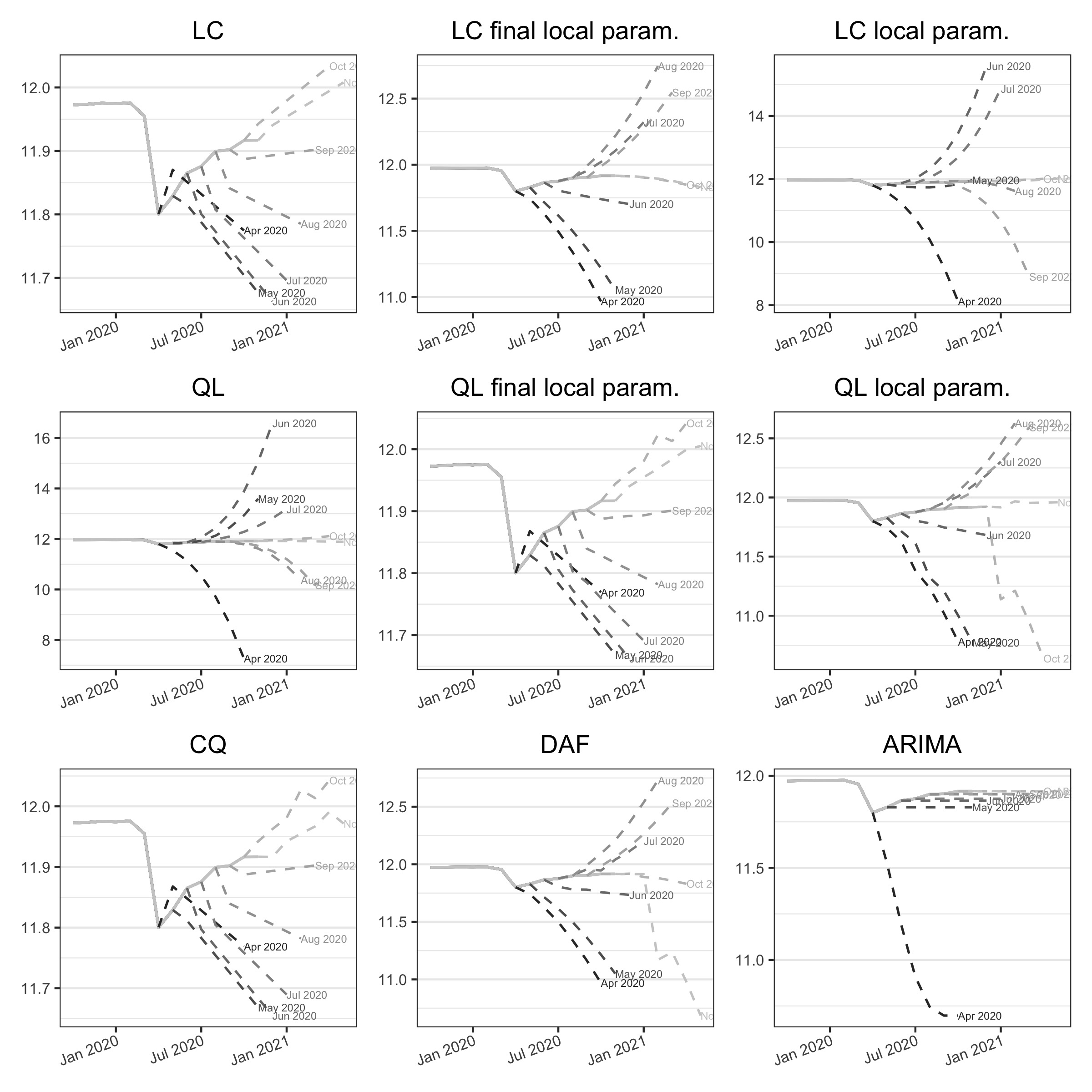 Figure 3.8 and figure 3.9 show the successive estimates of the trend-cycle and the associated implicit forecast for the US employment during the COVID-19. First, we observe that while the real turning point is in April 2020, the 13-term Henderson filter produces final estimates of the trend-cycles, biased by the presence of a huge outlier, which lead to a turning point detected in June 2020. Second, as in 2001, the CQ and DAF methods lead to lots of variability in the intermediate estimates. For the QL method, the local parametrisation seems to slightly reduce the revisions. For the LC method, local parametrisation has little impact on the estimates of the trend-cycle but the associated implicit forecasts are not plausible: the final estimate of the slope is biased by the outlier. Third, the ARIMA model can lead to unrealistic forecasts.