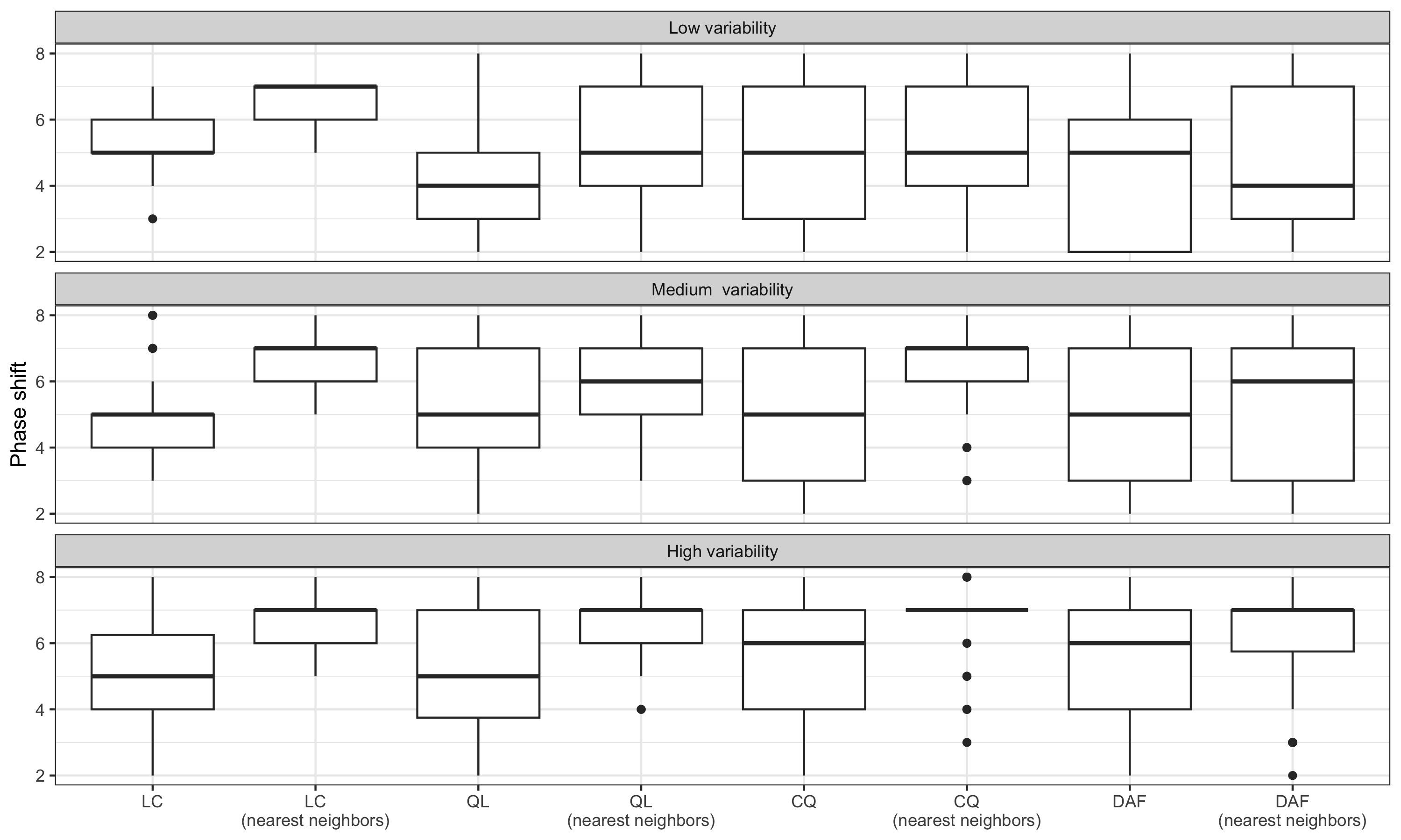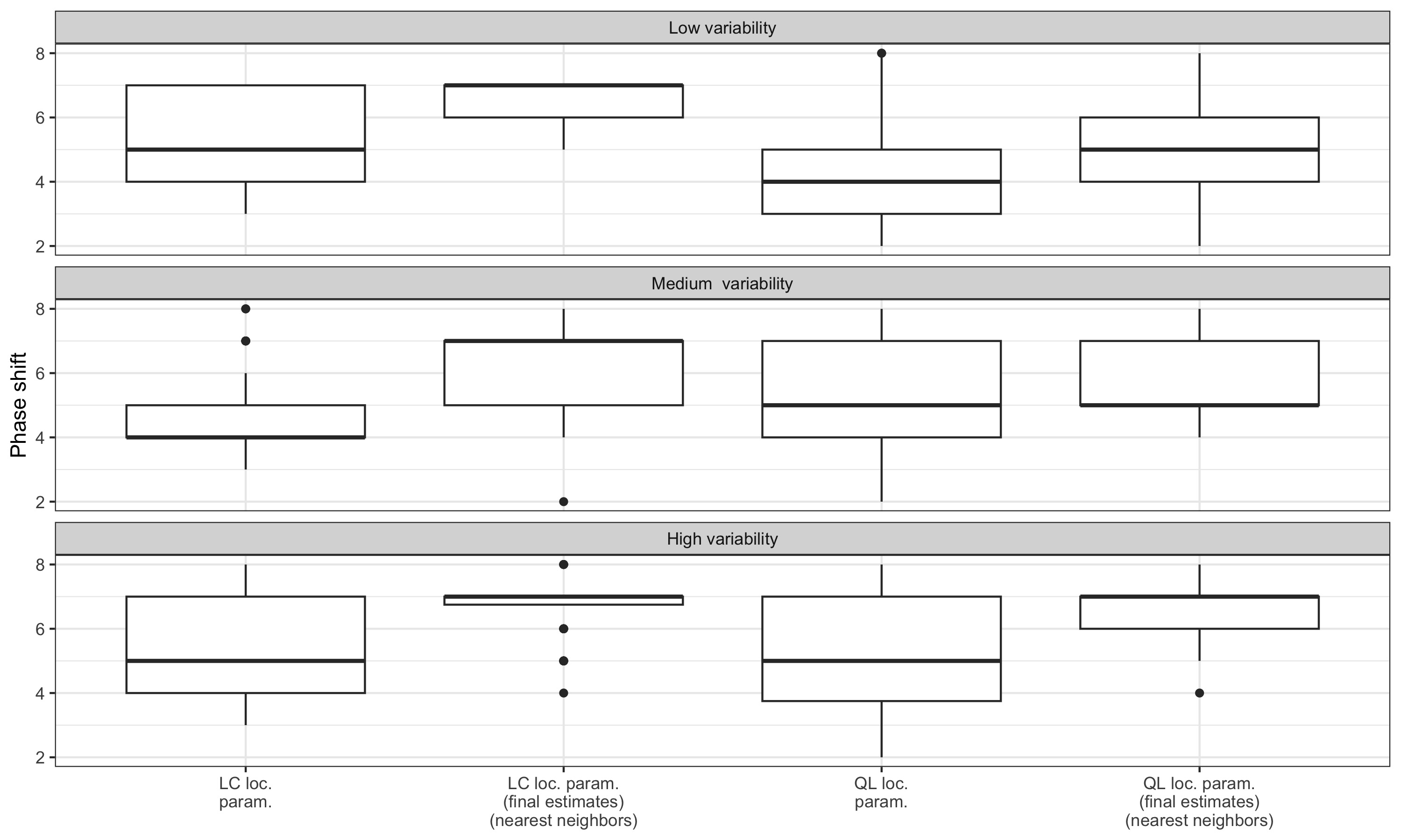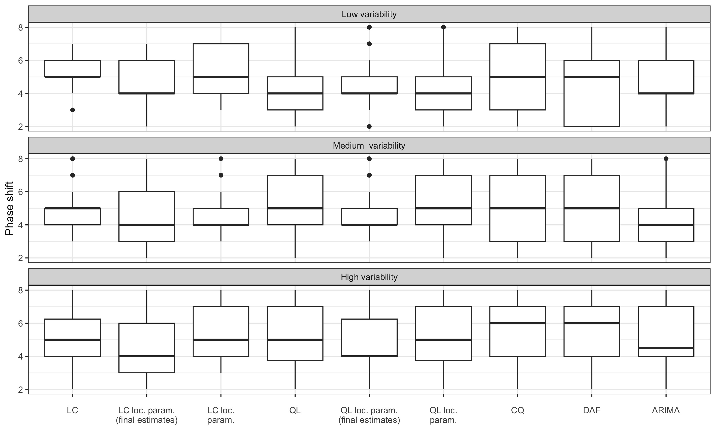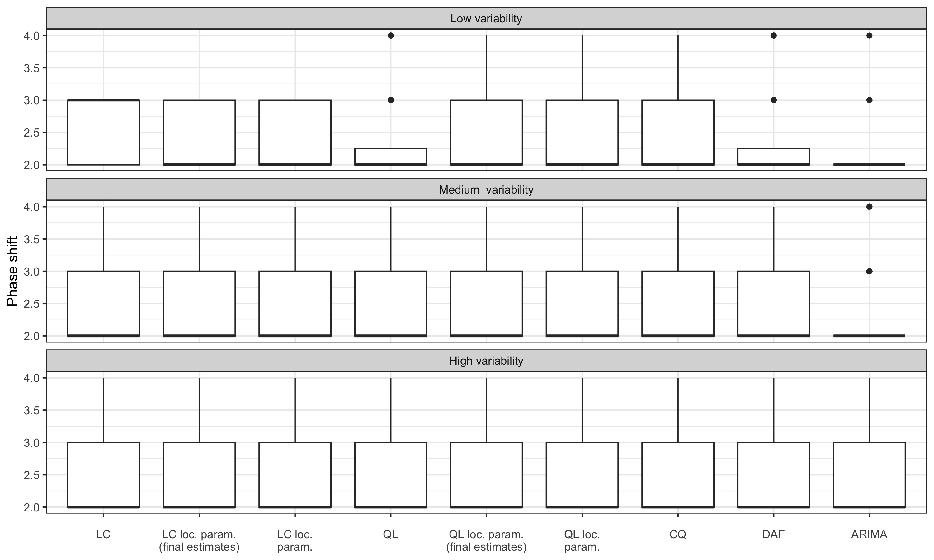 For series with moderate variability, local parametrisation of the LC and QL filters reduces the phase shift. For series with high variability, the phase shift is only reduced by using the final \(\hat\delta\) parameters: real-time estimates seem to add more variance. For series with low variability, performance seems to be slightly improved only with the LC filter.