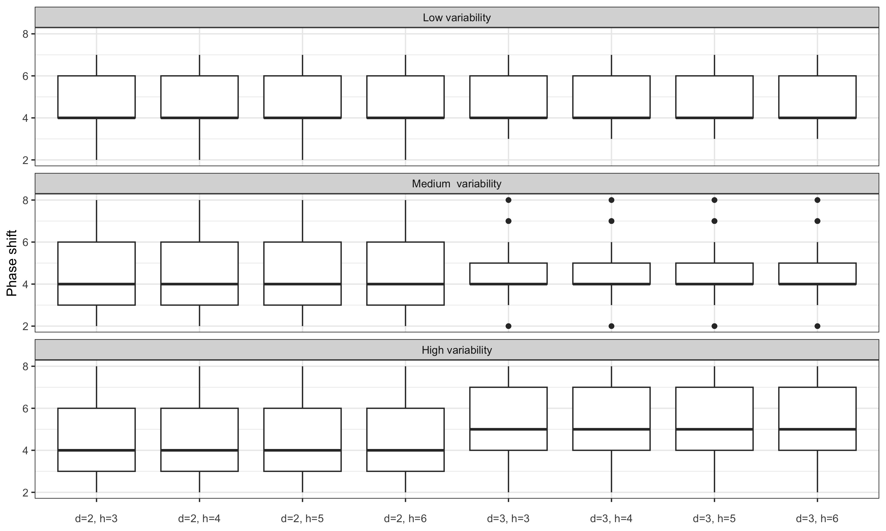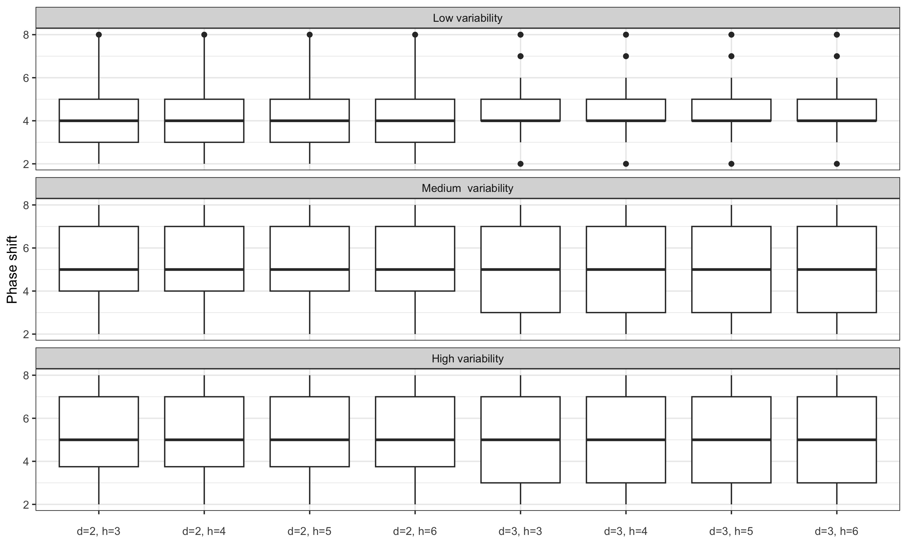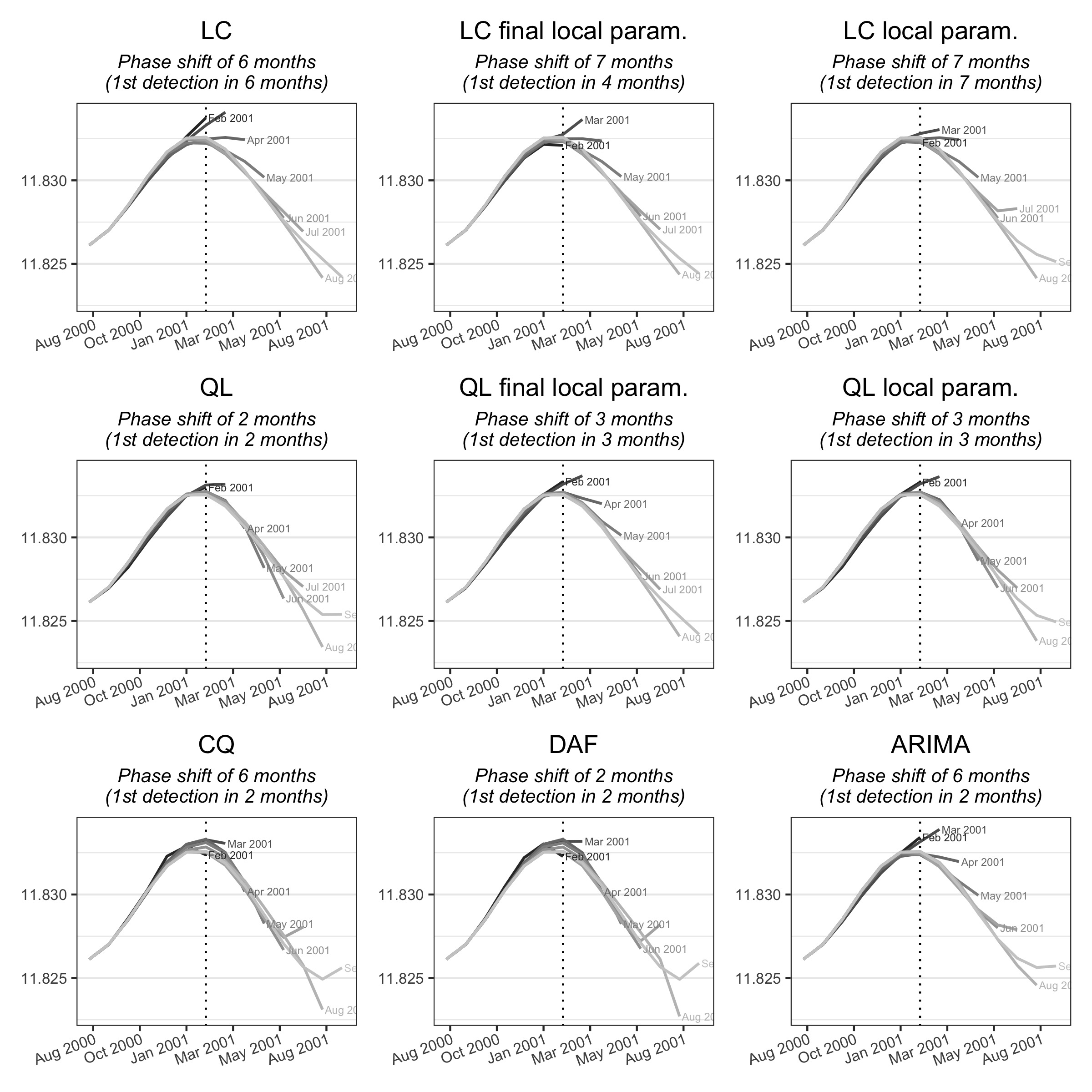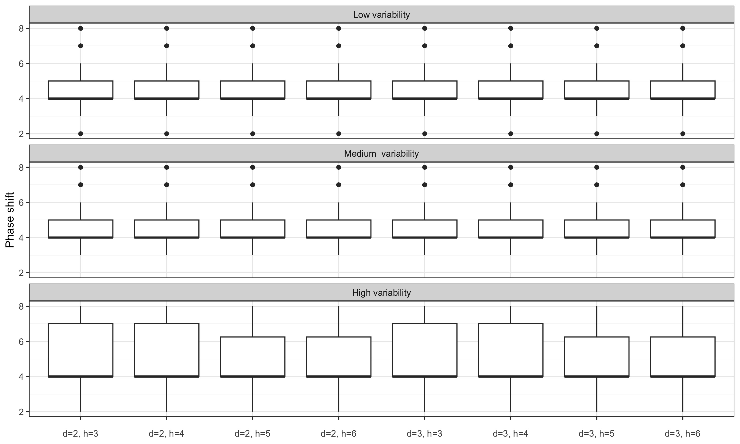 For series with moderate variability, local parametrisation of the LC and QL filters reduces the phase shift. For series with high variability, the phase shift is only reduced by using the final \(\hat\delta\) parameters: real-time estimates seem to add more variance. For series with low variability, performance seems to be slightly improved only with the LC filter.