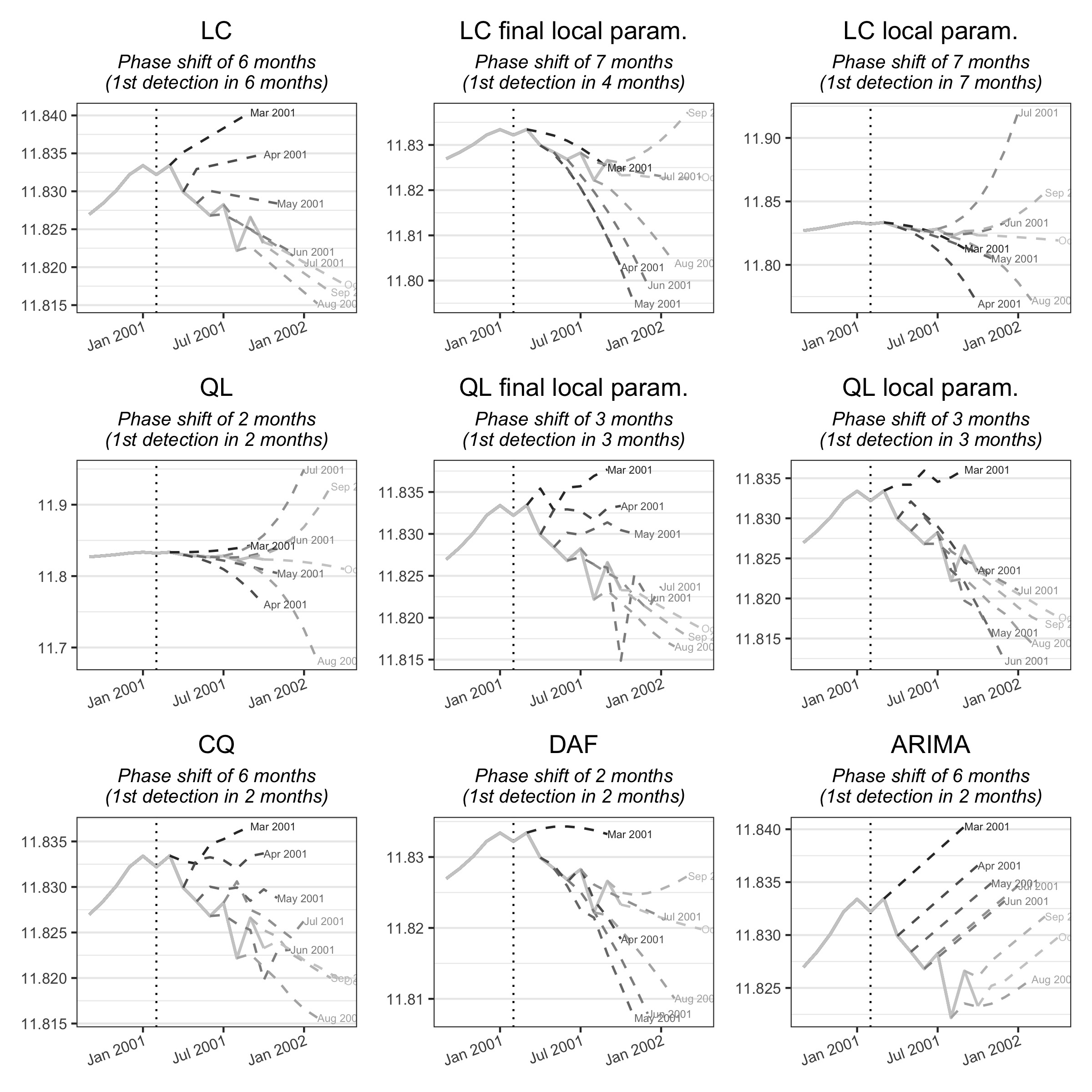 Figure 3.6 shows the successive estimates of the trend-cycle using the different methods studied. For this series, the phase shift is 6 months for the LC and CQ methods and the extension of the series by ARIMA. It is of two months for the other methods (QL, DAF). In this example, local parametrisation does not reduce the phase shift, but it does reduce revisions. The QL and DAF polynomials lead to greater variability in the intermediate estimates, especially in February 2001.