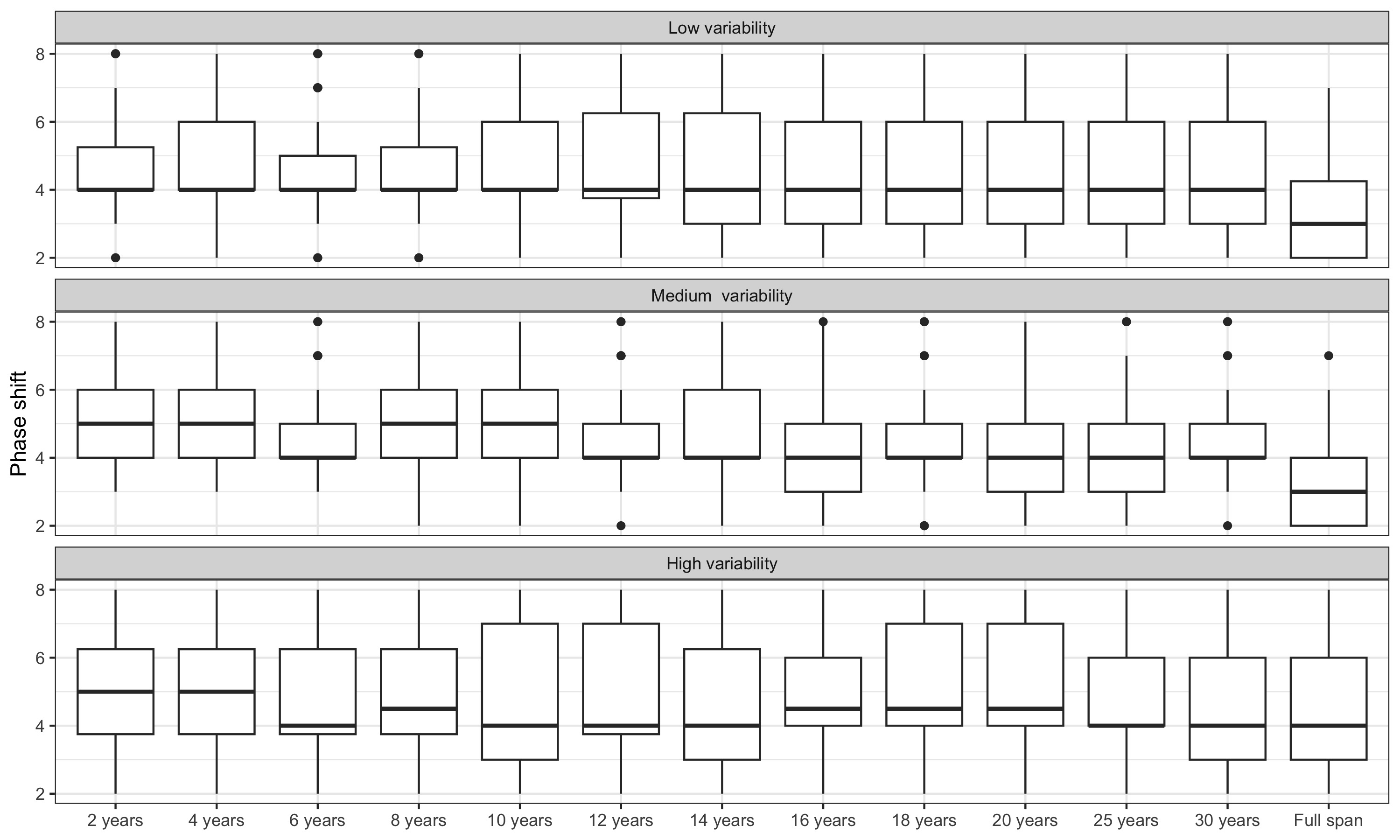 Figure 3.5 represents box plots of the phase shift: the box represents the interquartile range, the central horizontal line represents the median, the dot represents the outliers and the whisker the range of the data (if no outlier). For simulated series with medium variability (when a symmetric filter of length 13 is relevant), with the linear constant (LC) method, 50% of the turning point are detected with a phase shift of at most 5 months whereas when the LC filter is parametrised locally, 50% of the turning point are detected with a phase shift of at most 4 months. For the direct asymmetric filter (DAF), 25% of the turning are detected with a phase shift of at least 7 months (compares to 5 for the LC method).