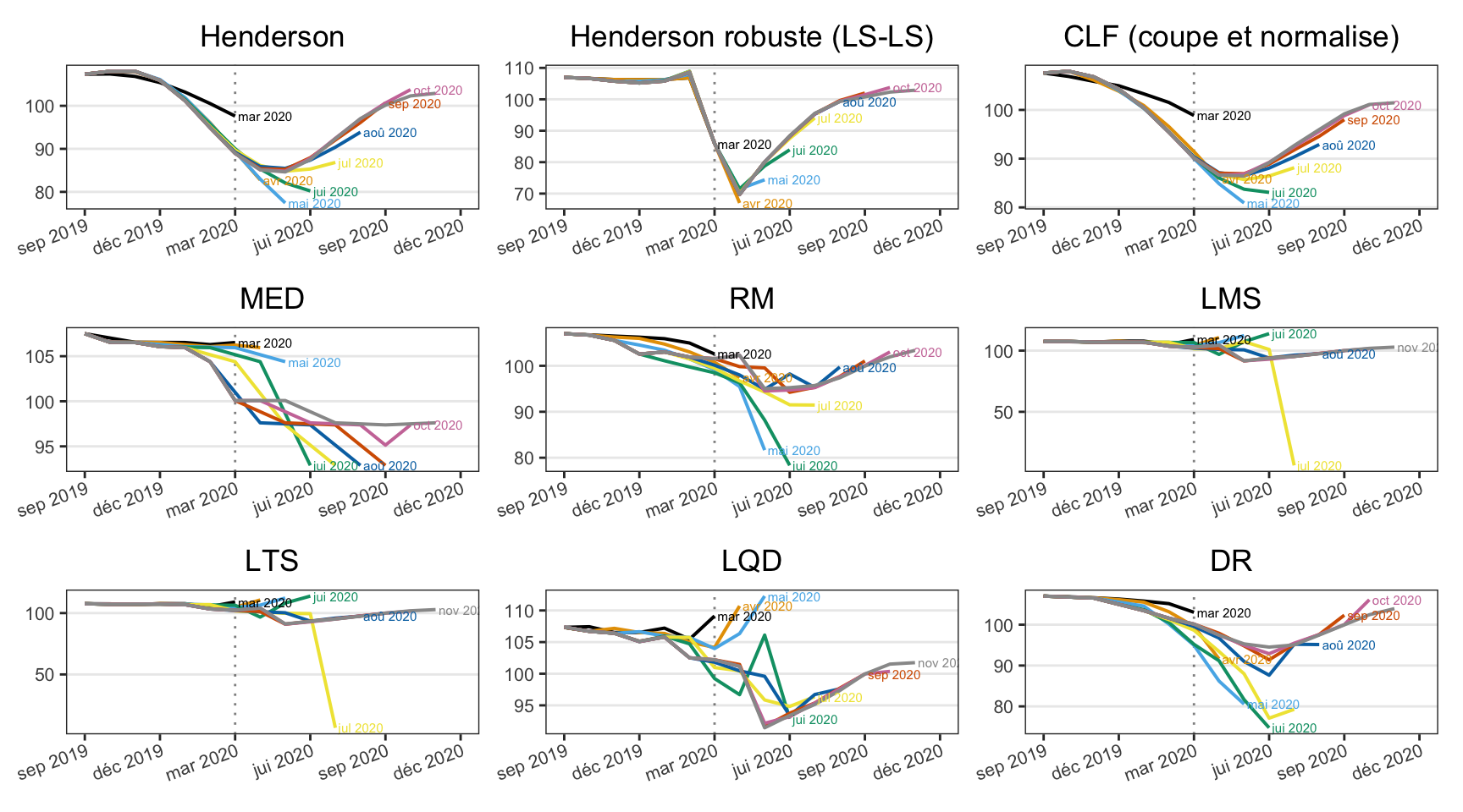 Dans cette étude, les performances des moyennes mobiles linéaires sont également comparées à des méthodes non-linéaires robustes pour la plupart basées sur la médiane. Lorsque les tendances sont lisses et le bruit faible (par exemple sur des séries simulées), ces méthodes fournissent des bonnes alternatives aux méthodes classiques en étant robustes aux chocs ponctuels et en reproduisant, dans la tendance-cycle, les chocs permanents (mais pour qu’ils soient reproduits à la bonne date il faut attendre l’estimation finale). Toutefois, sur des séries réelles, les révisions sont plus importantes (avec parfois des estimations intermédiaires non cohérentes), ce qui suggère, comme notamment indiqué par Gather, Schettlinger, et Fried (2006), d’utiliser des quantiles plus élevés que la médiane pour les estimations en temps réel. Par ailleurs, lorsque les points de retournement sont associés à des chocs (comme lors du COVID-19), en étant naturellement robustes aux chocs, ces méthodes ne vont pas permettre d’estimer une tendance-cycle qui reproduirait les points de retournement.