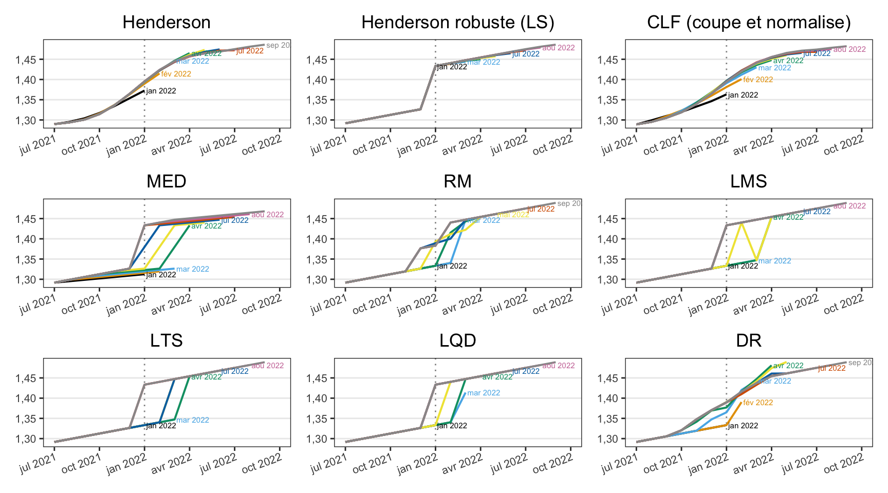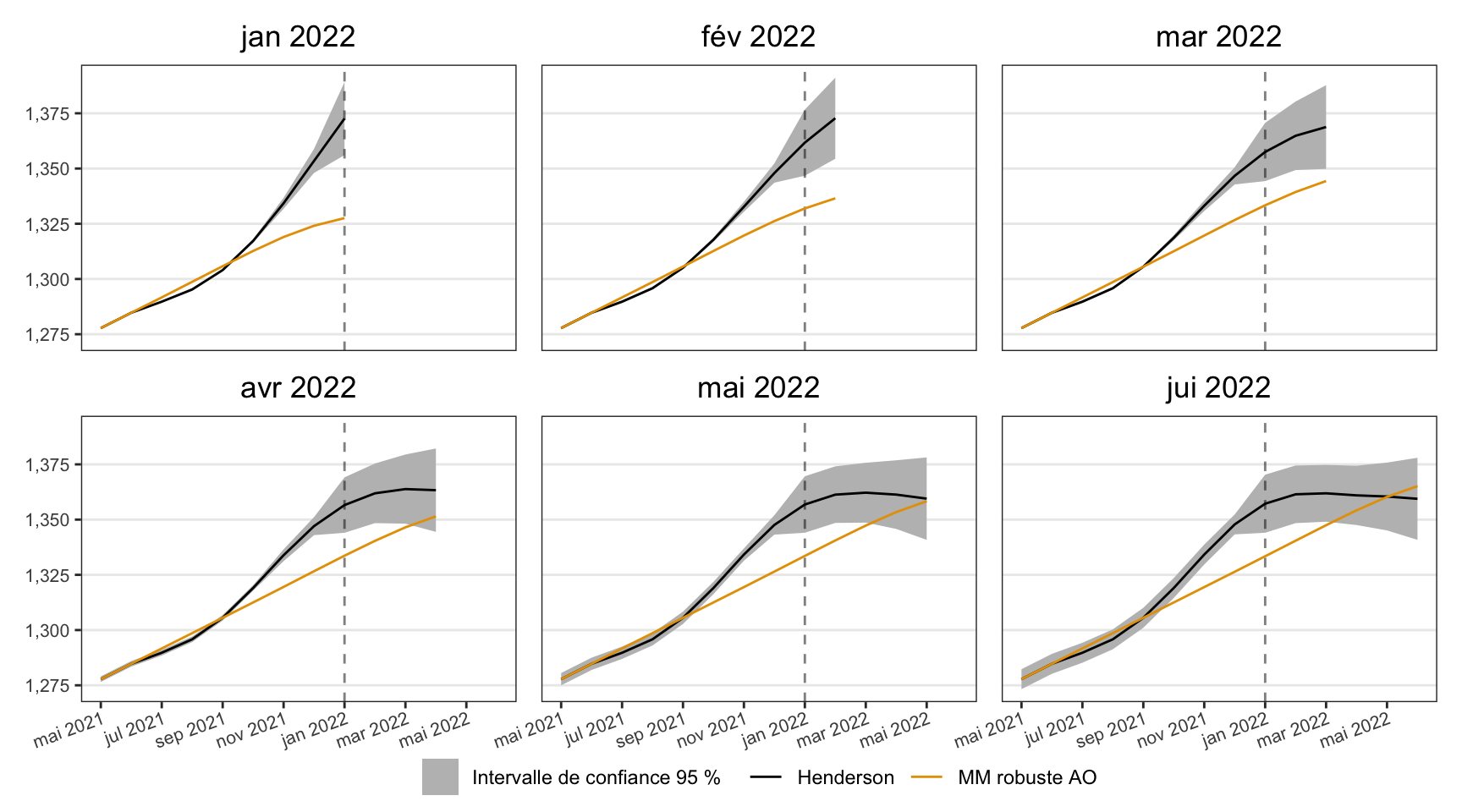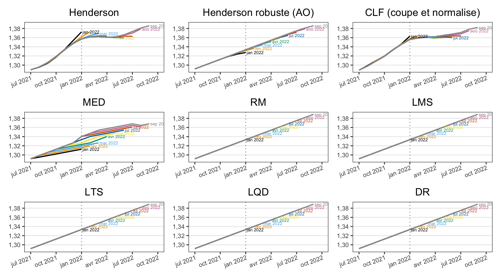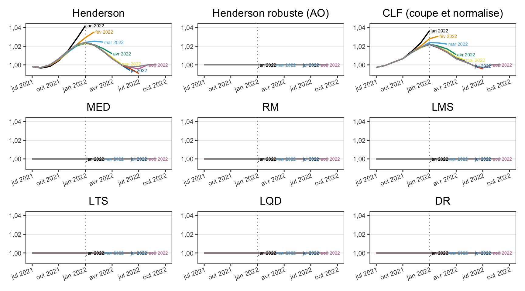Les moyennes mobiles linéaires classiques (Henderson et CLF) donnent des résultats similaires : la rupture en niveau est lissée, les points avant le choc sont donc surestimés et ceux après le choc sous-estimés. Il y a également d’importantes révisions pour la première estimation de janvier 2022 (date du choc). Il n’y a en revanche quasiment aucune révision pour les moyennes mobile de Henderson robuste à un choc permanent en janvier 2022.