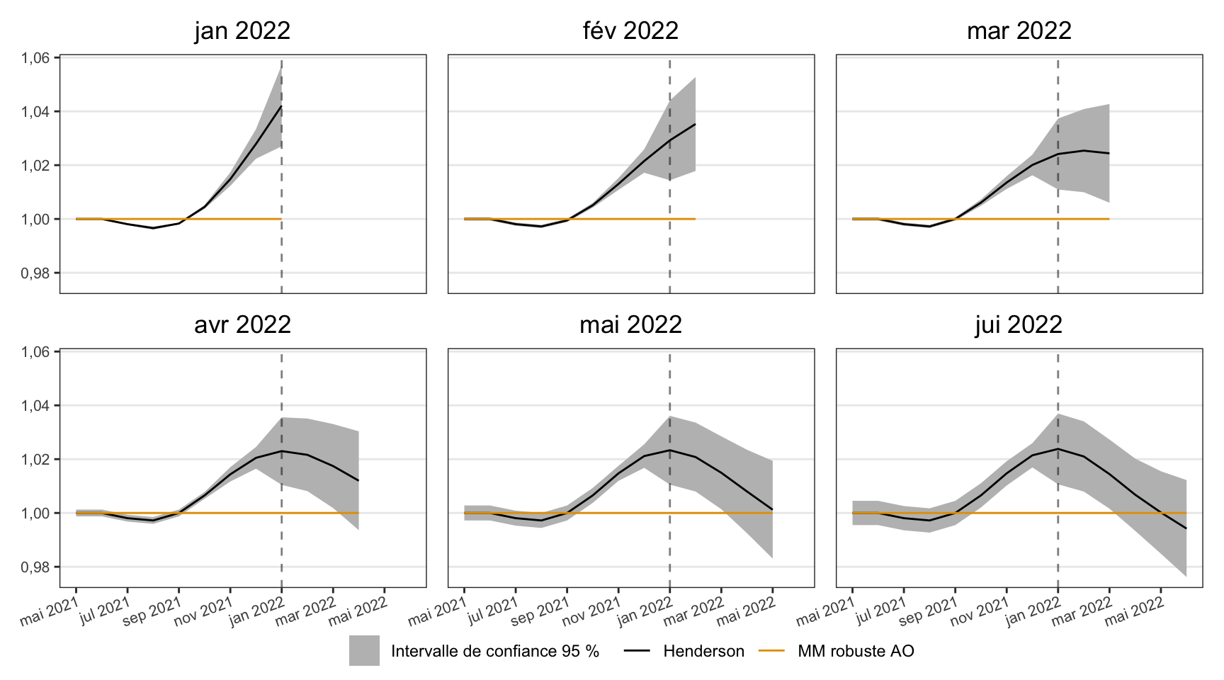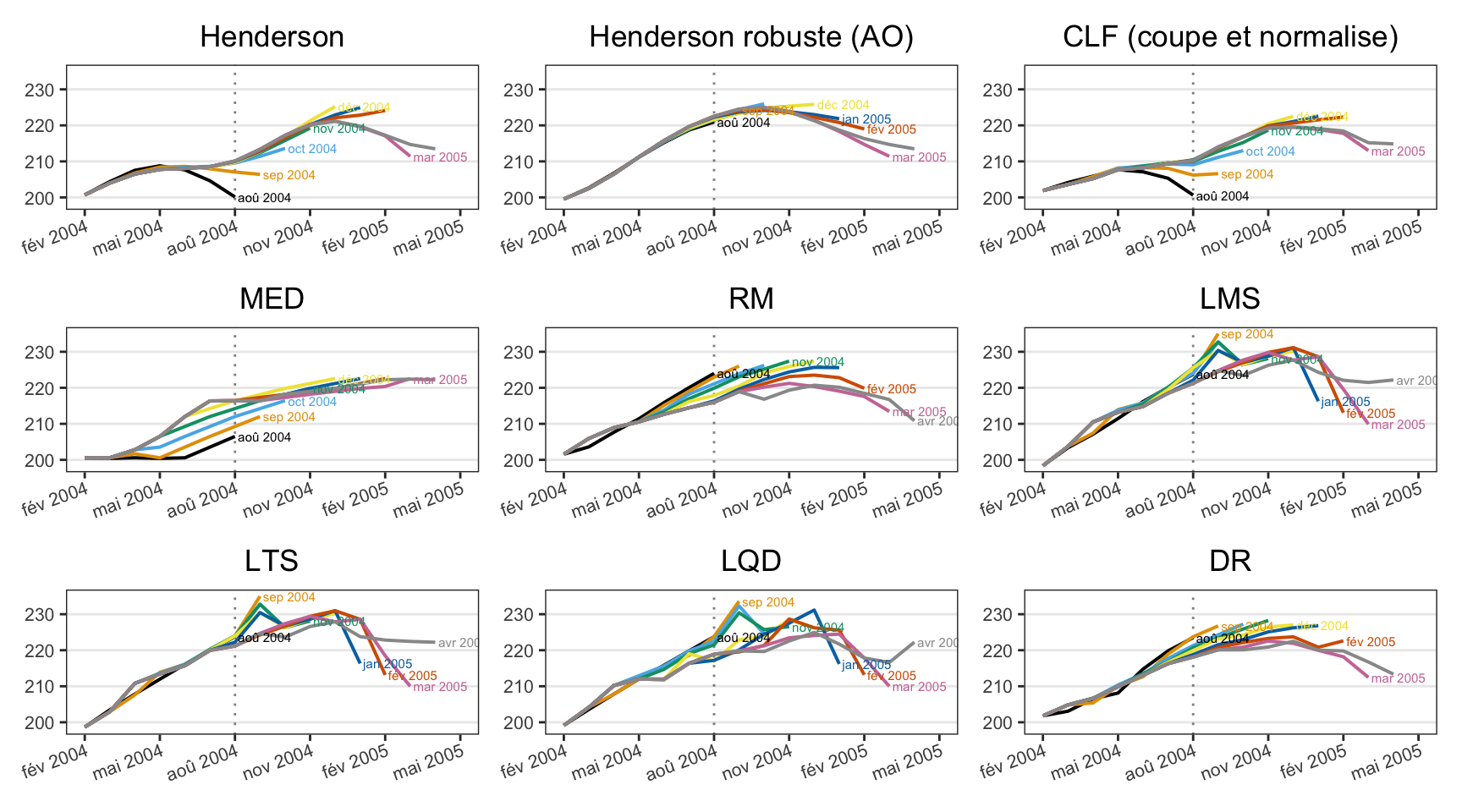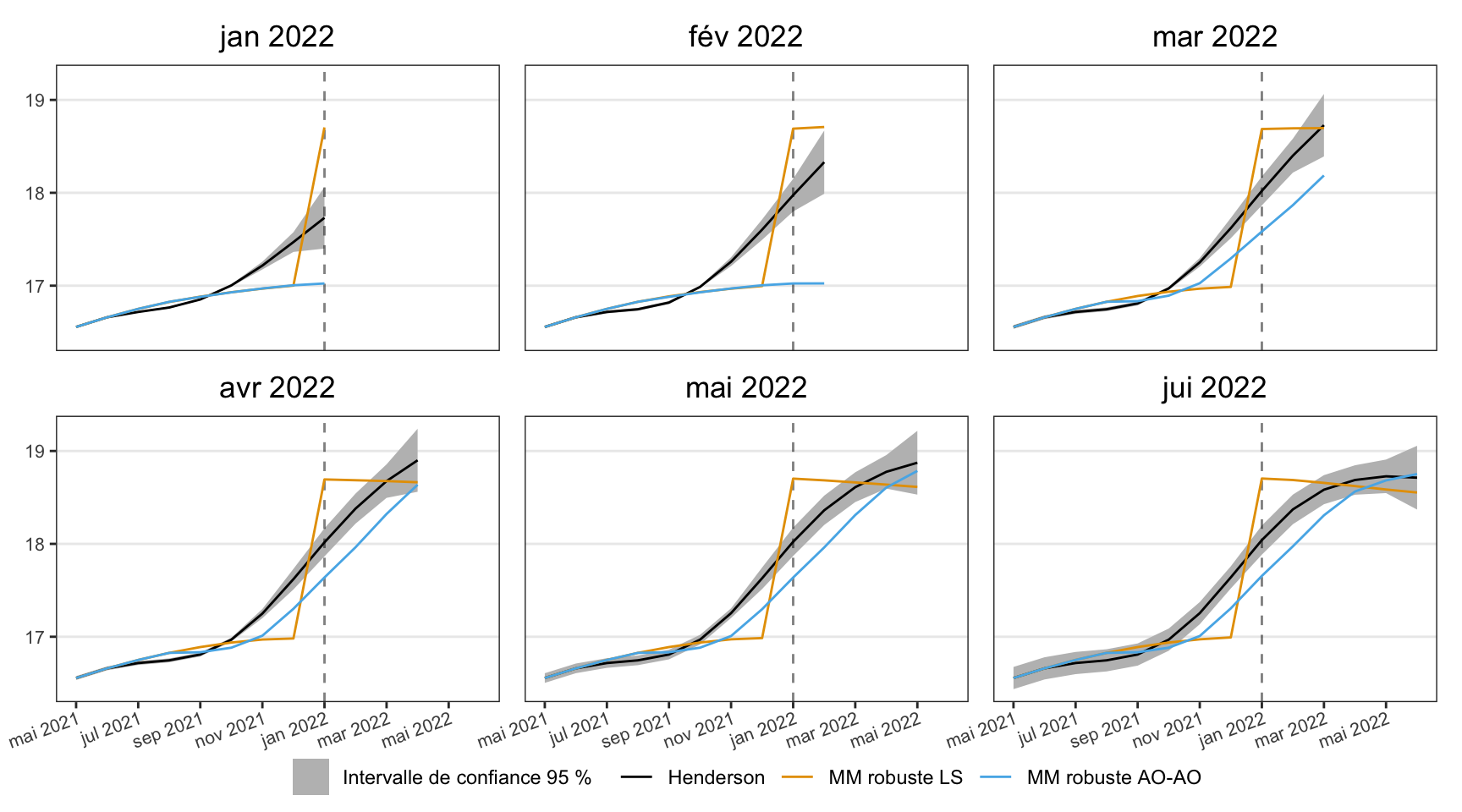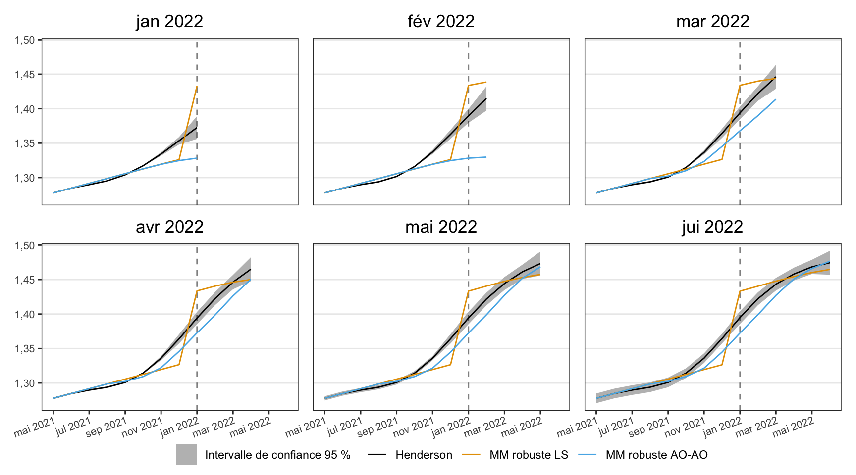 Les moyennes mobiles linéaires classiques (Henderson et CLF) donnent des résultats similaires : la rupture en niveau est lissée, les points avant le choc sont donc surestimés et ceux après le choc sous-estimés. Il y a également d’importantes révisions pour la première estimation de janvier 2022 (date du choc). Il n’y a en revanche quasiment aucune révision pour les moyennes mobile de Henderson robuste à un choc permanent en janvier 2022.