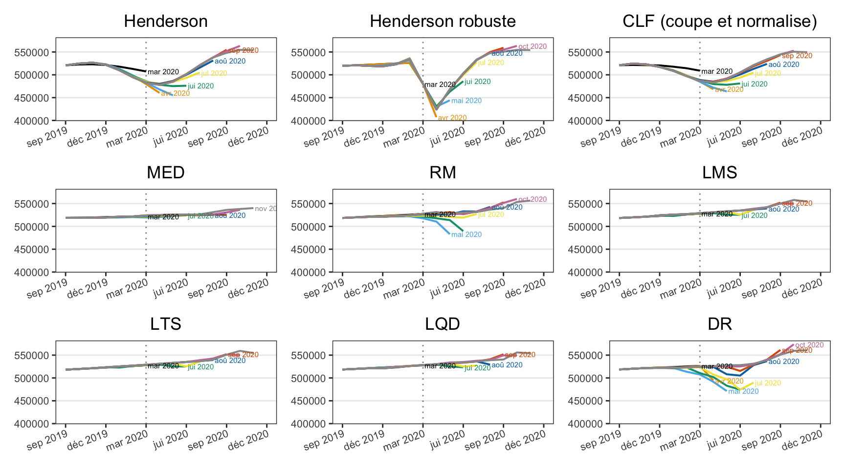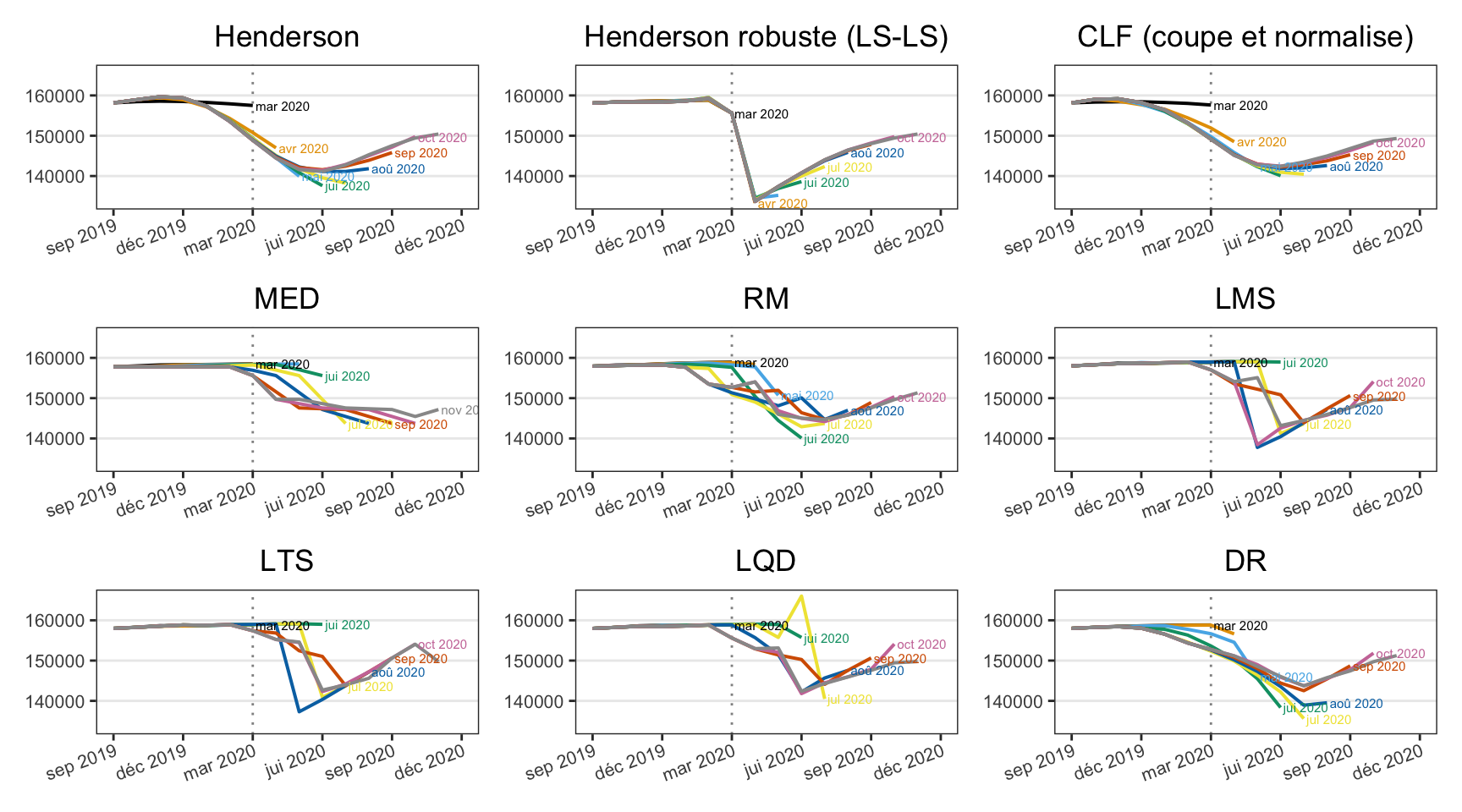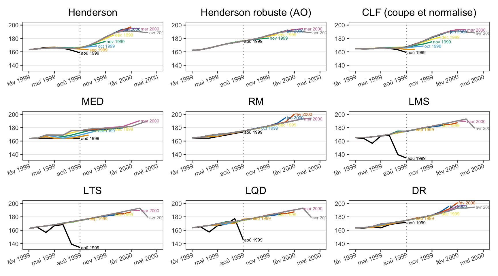 Note : Henderson : Henderson (estimation finale) et Musgrave (estimations intermédiaires) ; Henderson robuste : moyennes mobiles robustes de Henderson (estimation finale) et de Musgrave (estimations intermédiaires) ; CLF : cascade linear filter (estimation finale) et méthode « couper-et-normaliser » (estimations intermédiaires) ; MED : Médiane mobile ; RM : médiane répétée ; LMS : moindres carrés médians ; LTS : moindres carrés élagués ; LQD : moindres quartiles différenciés ; DR : Régression profonde.