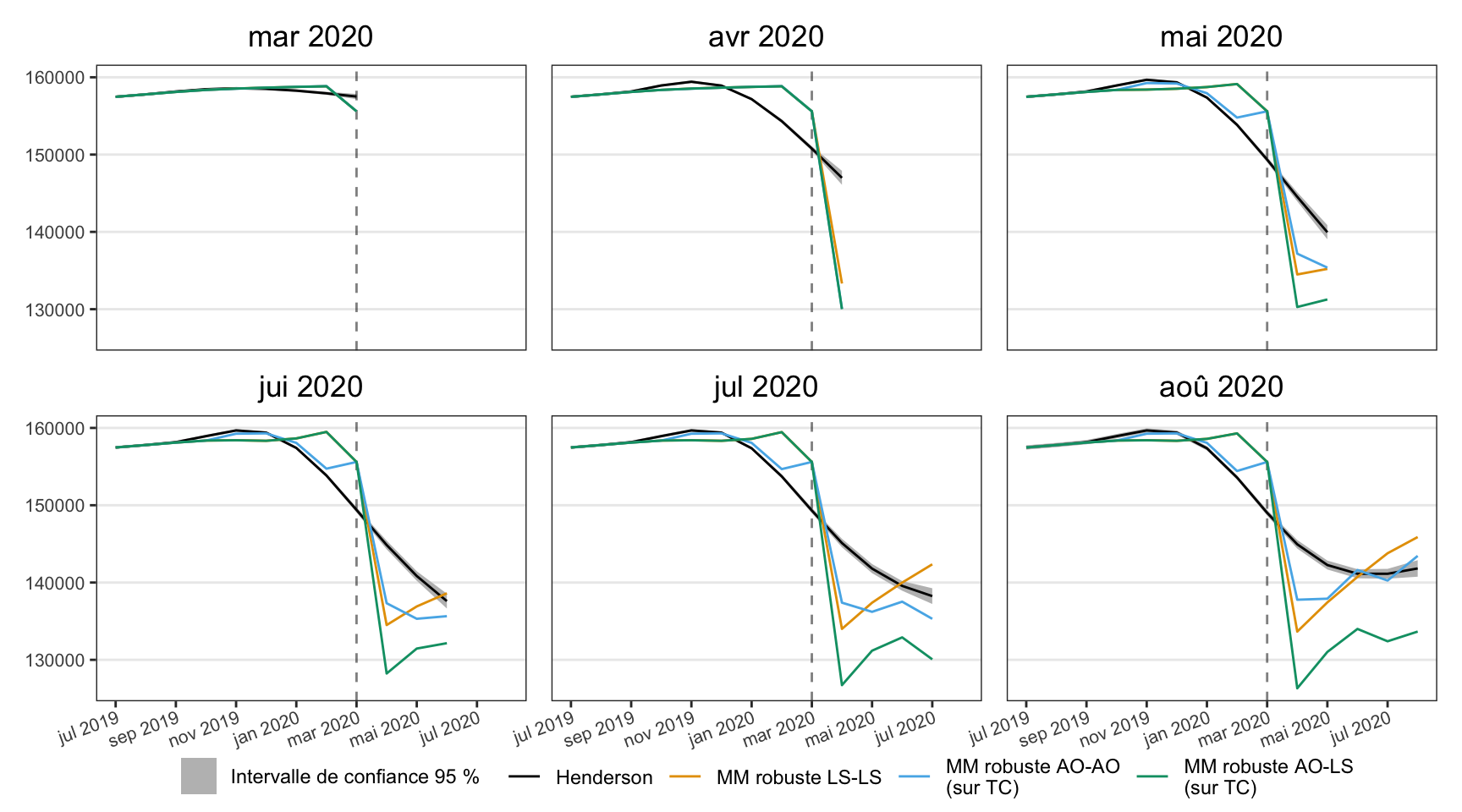 Figure 4.40 - Intervalles de confiance pour les filtres de Henderson et filtres de Henderson robustes robuste pour l’emploi aux États-Unis à partir de mars 2020