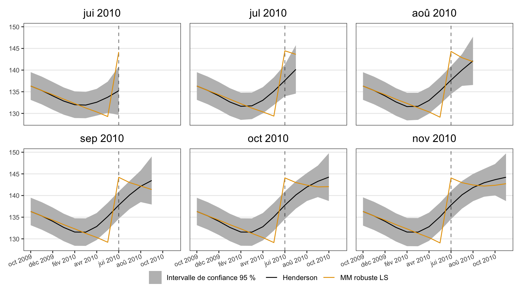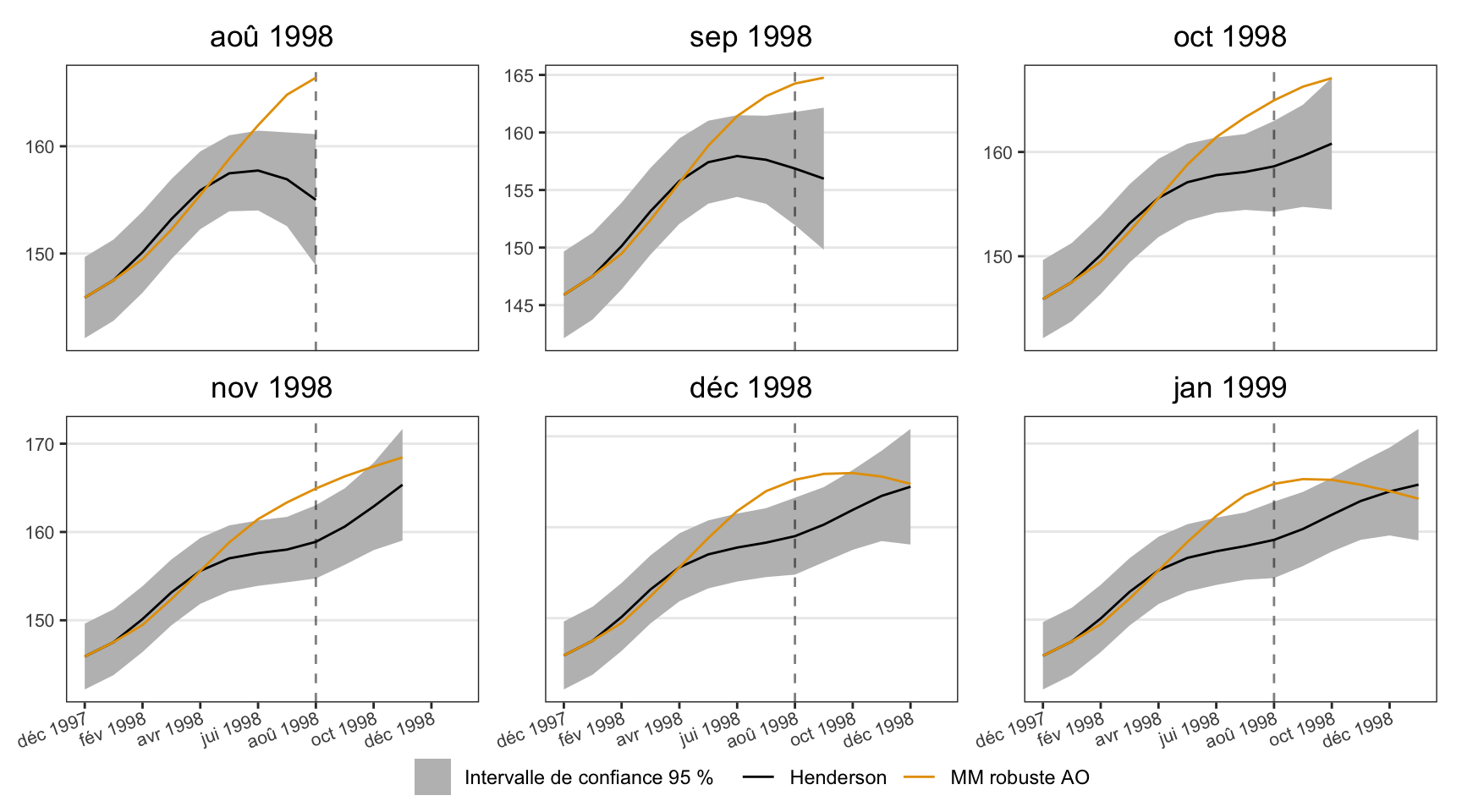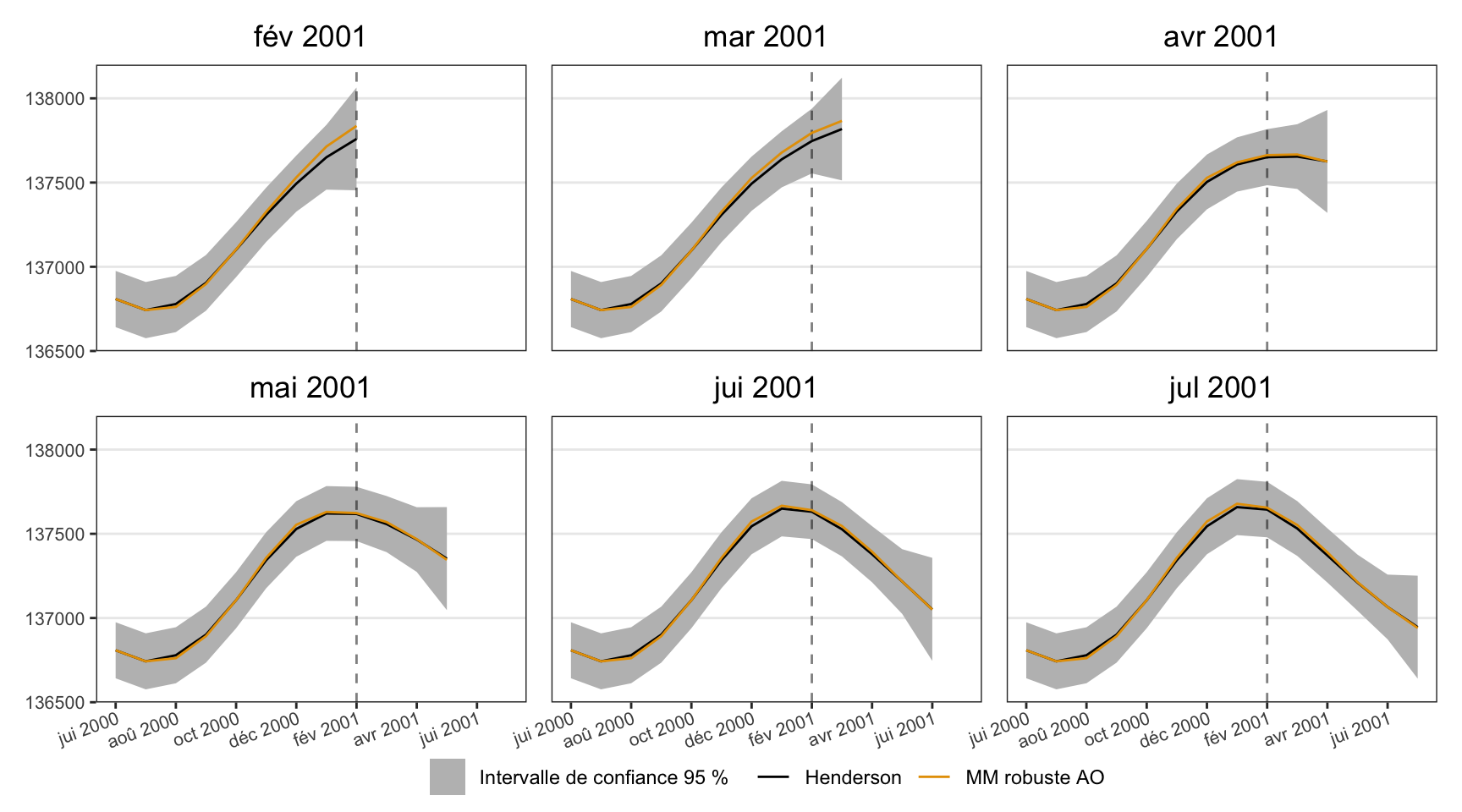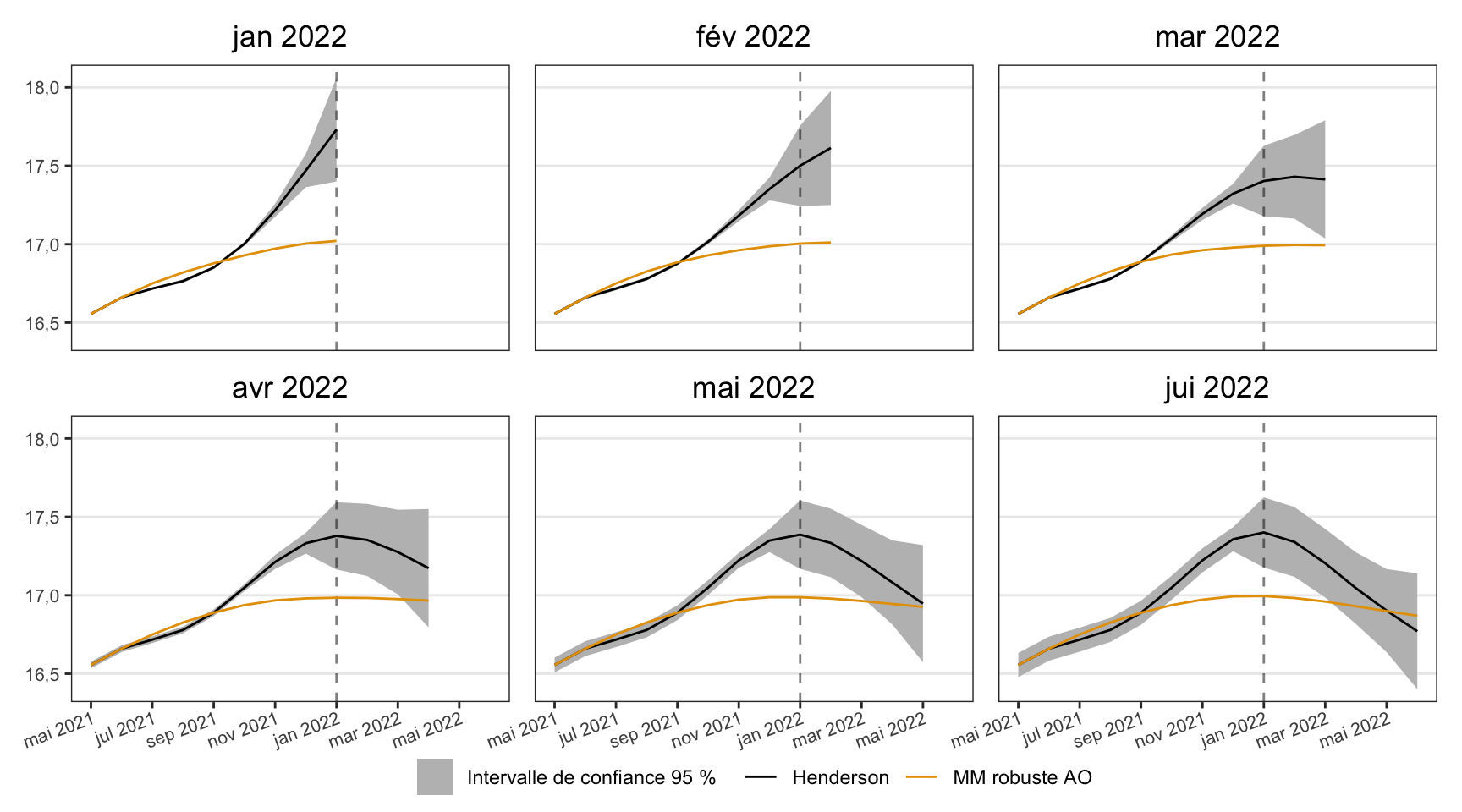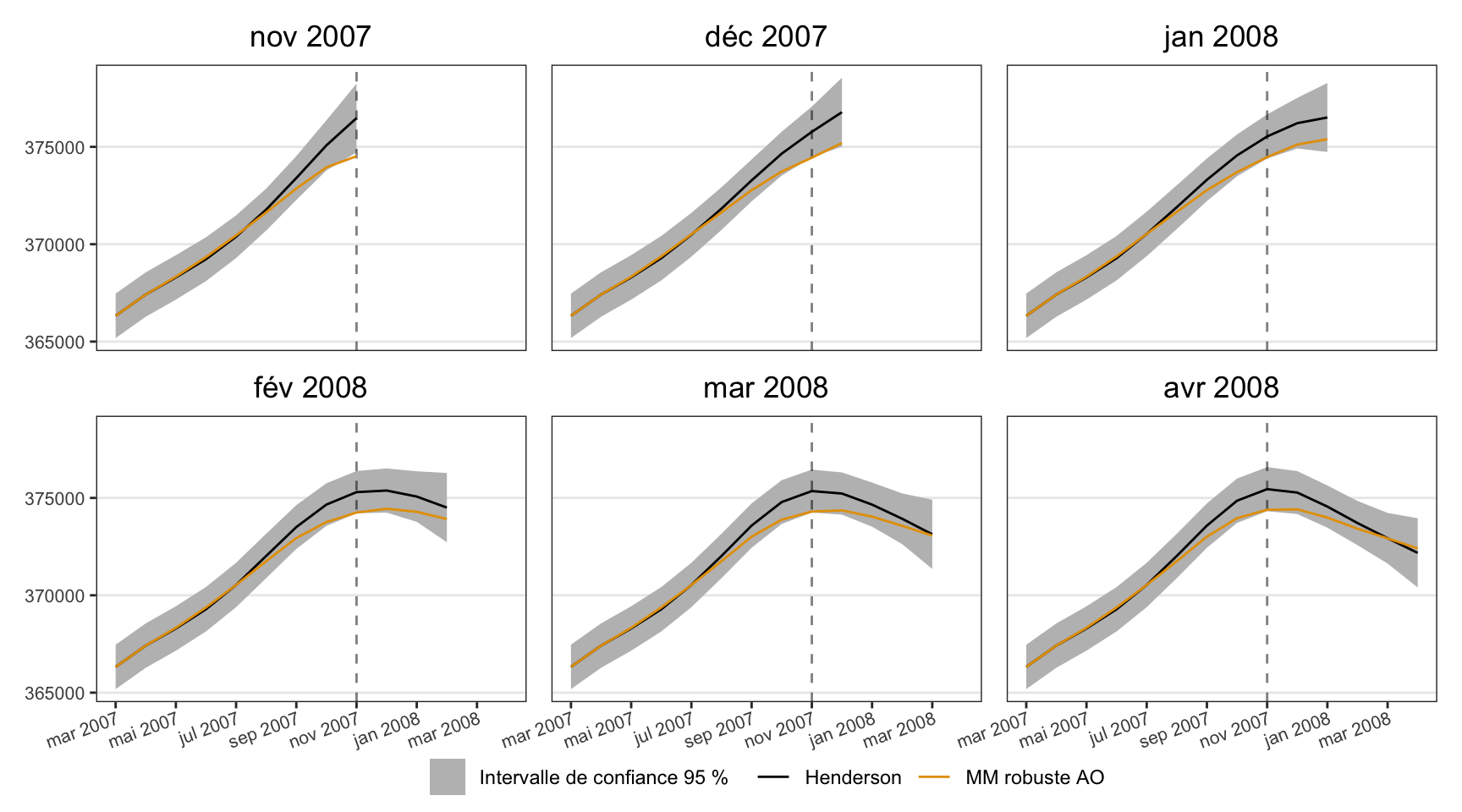 2. Valider la modélisation retenue en comparant l’intervalle de confiance de l’estimation de la tendance-cycle avec les moyennes mobiles de Henderson et de Musgrave avec l’estimation en utilisant les moyennes mobiles robustes. La Section 4.2.4 décrit la méthodologie pour la construction d’intervalles de confiance pour des estimations basées sur des moyennes mobiles.