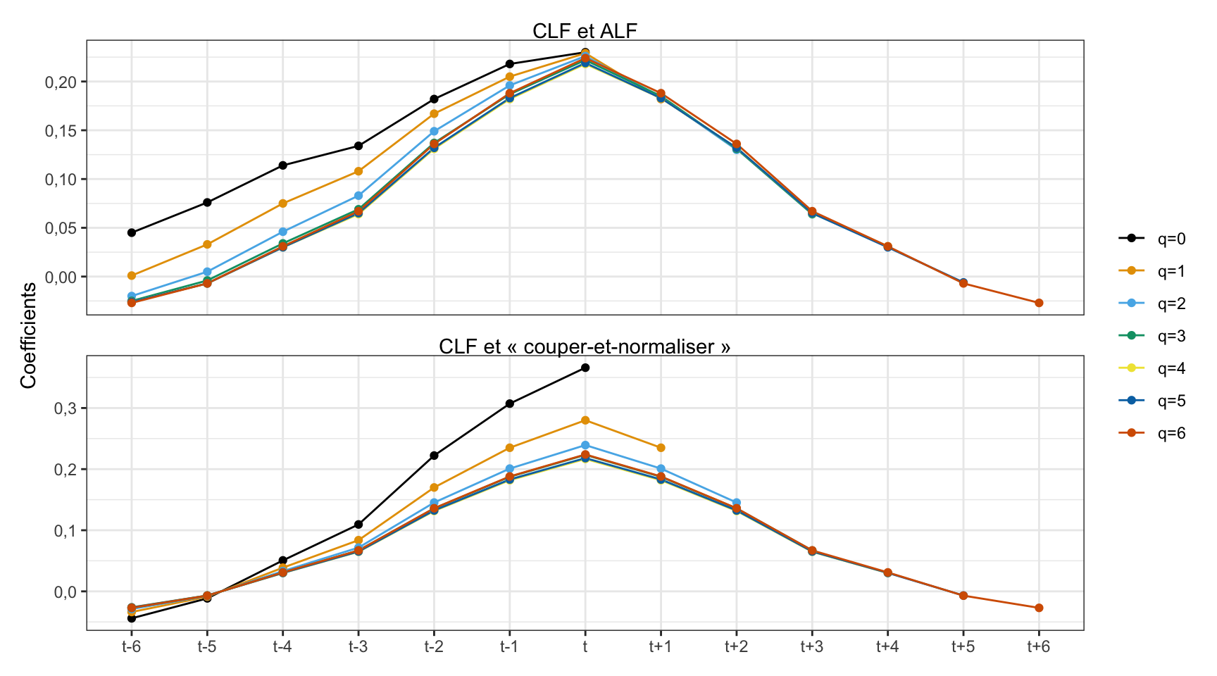 C’est la moyenne mobile CLF qui est utilisée par Statistique Canada pour l’estimation de la tendance-cycle5. Pour l’estimation en temps réel, Statistique Canada utilise la méthode « couper-et-normaliser » qui consiste à recalculer les poids, à partir de la moyenne mobile symétrique, en n’utilisant que les poids associées aux observations disponibles (couper) et en renormalisant pour que la somme des coefficients soit égale à 1 (normaliser). C’est l’approche qui sera utilisé dans cet article (plutôt que l’utilisation des ALF).