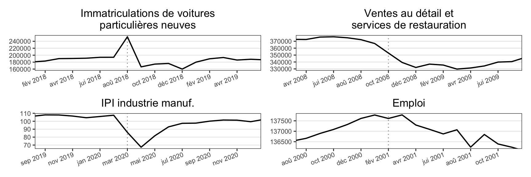 1. Partir sur un a priori basé sur une information économique (ex : baisse attendue de l’économie au moment des confinements durant le COVID-19, hausse attendue suite à une mise en place d’une politique…) ou sur des modèles statistiques (comme le module de détection des points atypiques de X-13ARIMA-SEATS basé sur un modèle RegARIMA).