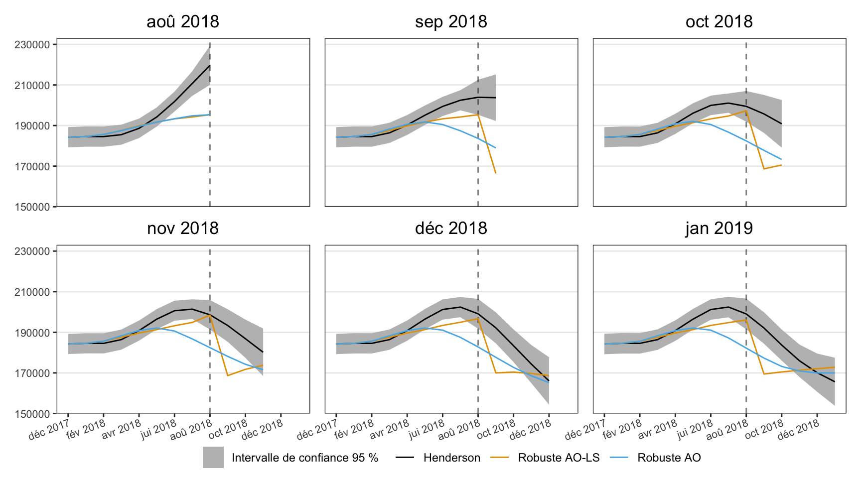 Les méthodes robustes ne sont pas affectées par le choc ponctuel mais ne reproduisent pas le changement de niveau à la bonne date (figure 4.15). Les moyennes mobiles linéaires de Henderson et CLF ont des résultats similaires : fortes révisions en août 2018, un point de retournement détecté en avance (juillet 2018). Les moyennes mobiles robustes conduisent à peu de révisions autour des chocs. Lorsque l’on ne modélise que le choc ponctuel d’août (figure 4.16) un point de retournement est détecté en mars 2018, ce qui parait peu plausible.