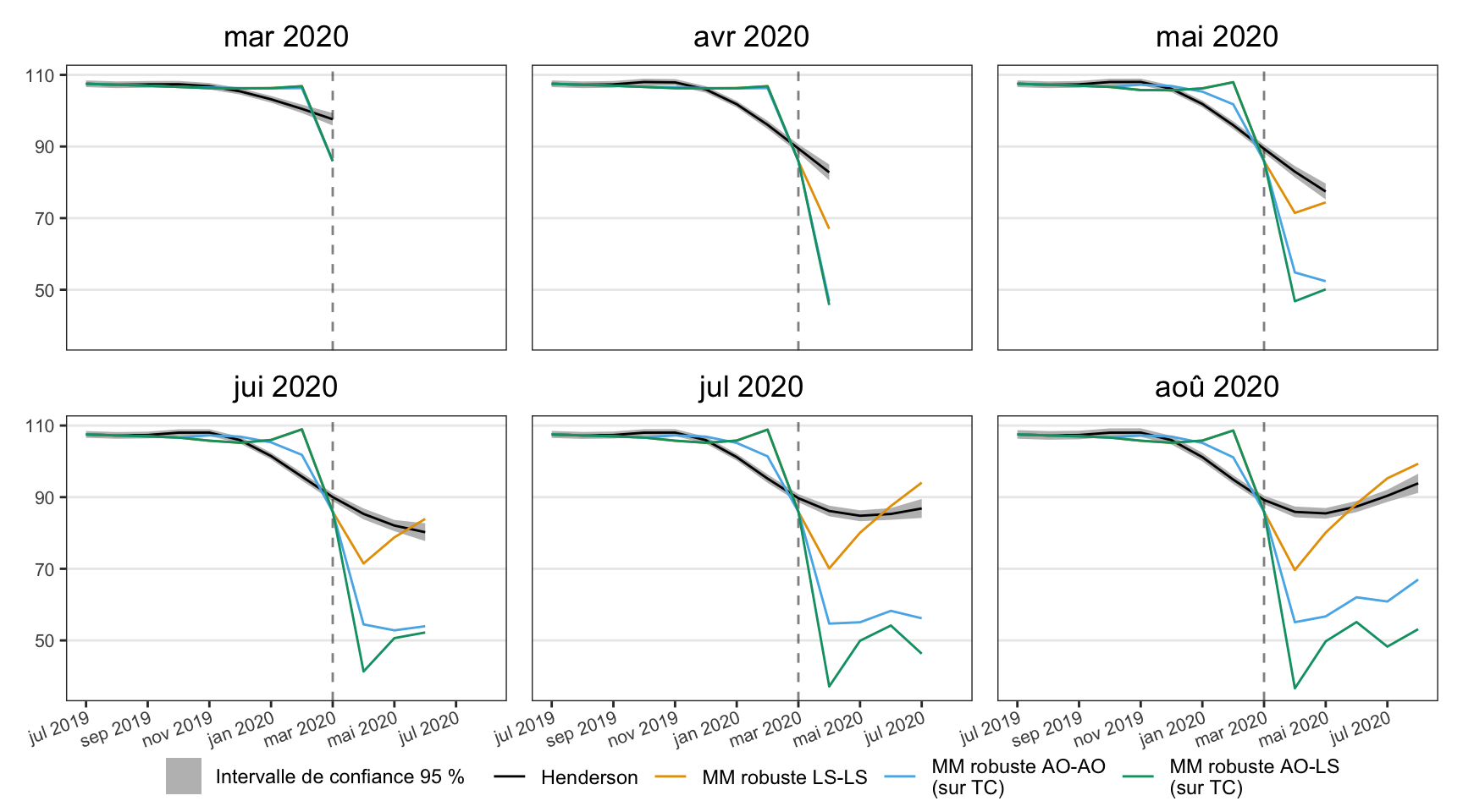L’estimation de \(\widehat{TC}_t\) étant faite par un méthode linéaire, elle est sensible à la présence de points atypiques qui peuvent notamment entraîner des révisions importantes. C’est par exemple le cas pendant la crise du COVID-19 qui a conduit Statistiques Canada et Australian Bureau of Statistics à suspendre la publication des tendances-cycles pendant cette période. Lors de périodes de fortes « turbulences » (comme la crise du COVID-19) où les points atypiques sont importants, les estimations directes de la tendance-cycle peuvent être biaisées. Comme notamment discuté par Matthews (2022), différentes stratégies peuvent alors être adoptées :