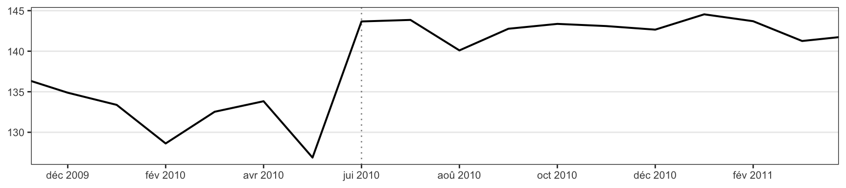 Pour les estimations intermédiaires (i.e., lorsque pour estimer la tendance-cycle à la date \(t\) on ne possède pas \(h\) observations avant ou après \(t\)), le package robfilter extrapole les données à partir du dernier modèle estimé. C’est-à-dire que si les données observées sont \(y_1, \dots, y_n\), alors pour \(q\in \{1,\dots, 6\}\) : \[ \widehat{TC}_{n-h+q} = \widehat{TC}_{n-h}+q\times\hat\beta_{1,n-h}. \] Pour la médiane mobile, cela revient à prolonger par la dernière valeur connue. Cette méthode n’est pas pertinente pour l’analyse conjoncturelle puisque les points de retournement sont détectés avec \(h\) périodes de retard. Une approche alternative consiste à appliquer les mêmes modèles mais en n’utilisant que les observations disponibles (pour estimer \(\widehat{TC}_{n-h+1}\) on utilise les \(2h\) observations entre \(n-2h+1\) et \(n\), …, et pour estimer \(\widehat{TC}_{n}\) on utilise les \(h+1\) observations entre \(n-h\) et \(n\)). Cette approche n’est pas implémentée dans robfilter mais peut être obtenue en ajoutant \(h\) valeurs manquantes au début et à la fin de la série : c’est ce qui sera effectué dans cet article.