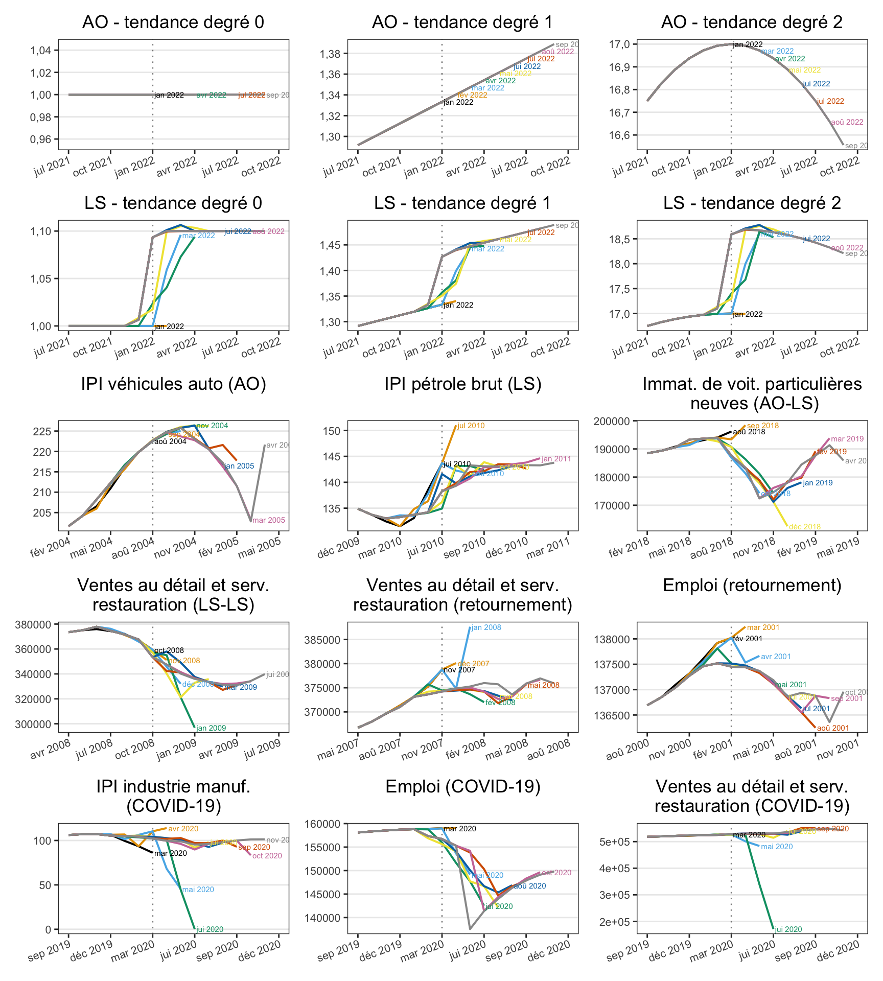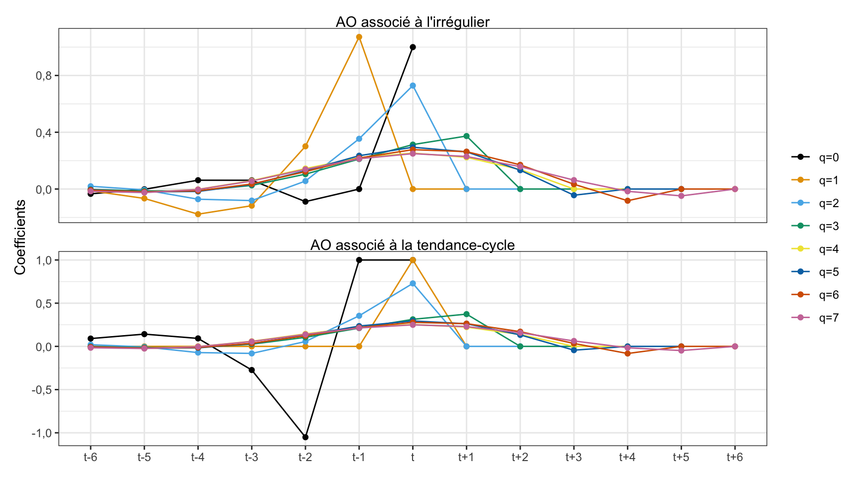 Toutefois, pour l’estimation en temps réel, sauf à avoir une information extérieure, il est difficile de distinguer un level shift (LS) d’un ou plusieurs additive outlier (AO) consécutifs. Le choix du type de point atypique aura une influence forte sur l’estimation (puisque les LS affectent la tendance-cycle et les AO l’irrégulier) et passer d’une spécification à l’autre entraînera des révisions importantes. Ces révisions seront même plus importantes que si, avant de décider de la bonne modélisation à adopter, les premières estimations avaient été faites avec des moyennes mobiles classiques.