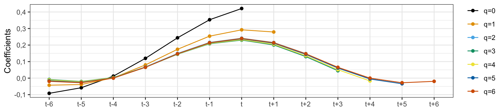 Pour le cas asymétrique, Proietti et Luati (2008) proposent une méthode générale pour construire les filtres asymétriques qui permet de faire un compromis biais-variance. Il s’agit d’une généralisation des filtres asymétriques de Musgrave (1964) (utilisés dans l’algorithme de désaisonnalisation X-13ARIMA-SEATS). En récrivant l’équation 4.1 : \[ \boldsymbol y_t=\begin{pmatrix}\boldsymbol U &\boldsymbol Z\end{pmatrix} \begin{pmatrix}\boldsymbol \gamma_t \\ \boldsymbol \delta_t\end{pmatrix}+ \boldsymbol \varepsilon_t = \boldsymbol U\boldsymbol \gamma_t + \boldsymbol Z \boldsymbol \delta_t +\boldsymbol \varepsilon_t, \quad \boldsymbol \varepsilon_t\sim\mathcal{N}(0,\boldsymbol D). \tag{4.3}\]\([\boldsymbol U,\boldsymbol Z]\) est de rang plein et forme un sous-ensemble des colonnes de \(\boldsymbol X\). L’objectif est de trouver une moyenne mobile asymétrique \(\boldsymbol \theta^{(a)}\) qui minimise l’erreur quadratique moyenne de révision (à la moyenne mobile symétrique \(\boldsymbol \theta\)) sous certaines contraintes. Ces contraintes sont représentées par la matrice \(\boldsymbol U=\transp{\begin{pmatrix}\transp{\boldsymbol U_{p}}&\transp{\boldsymbol U_{f}}\end{pmatrix}}\) : \(\transp{\boldsymbol U_p}\boldsymbol \theta^{(a)}=\transp{\boldsymbol U}\boldsymbol \theta\) (avec \(\boldsymbol U_p\) la matrice \((h+q+1)\times (d+1)\) qui contient les observations de la matrice \(\boldsymbol U\) connues lors de l’estimation par le filtre asymétrique). C’est ce qui est implémenté dans la fonction rjd3filters::mmsre_filter() du package R rjd3filters (Palate et Quartier-la-Tente 2024).