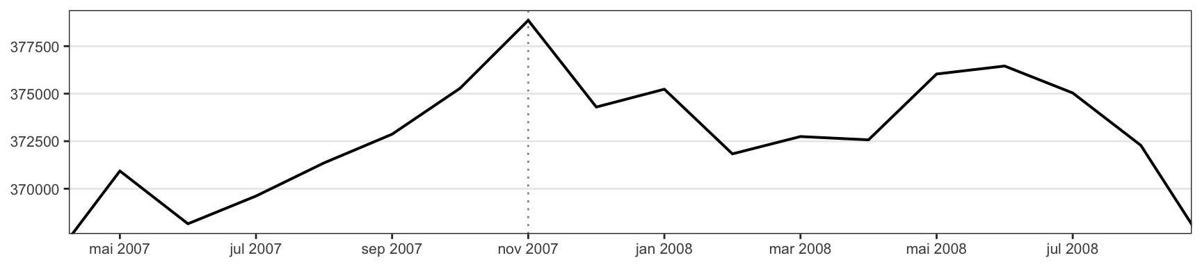 • La crise financière de 2008 (Section 4.3.2.2) à partir des ventes au détail et services de restauration aux États-Unis. Les données issues de la base FRED-MD (McCracken et Ng 2016) contenant des séries économiques sur les États-Unis8 (série RETAILx). Pour cette série la crise financière de 2008 peut s’étudier comme deux chocs permanents consécutifs en octobre et novembre 2008.
