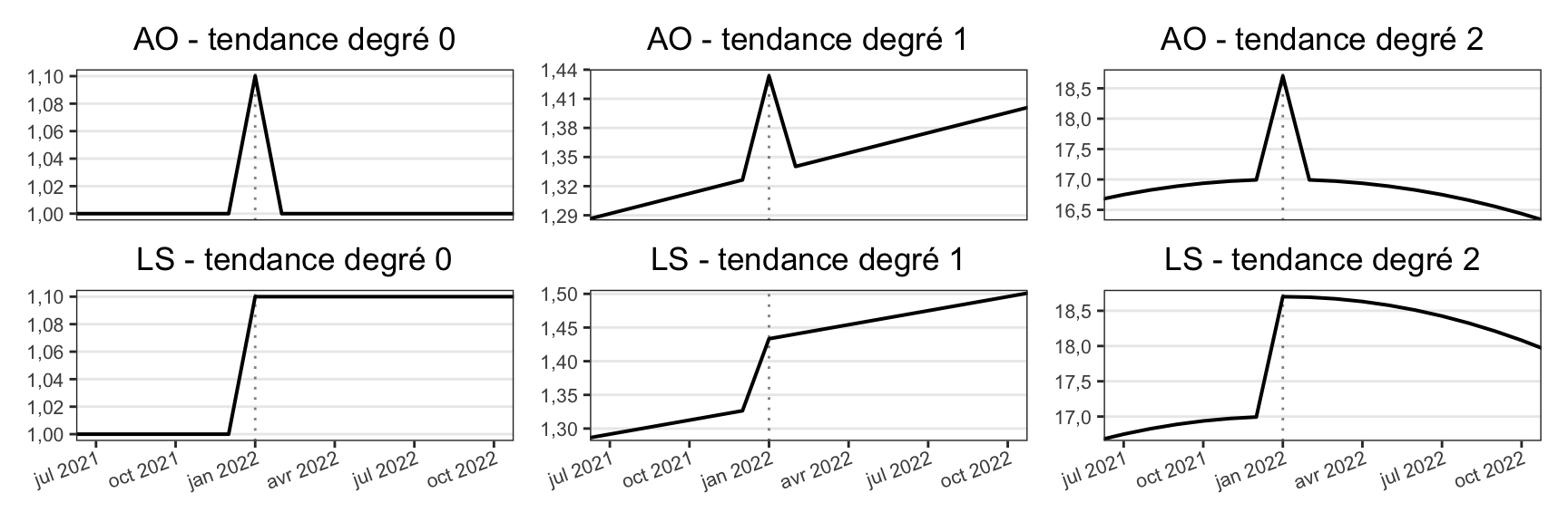 Afin d’illustrer les performances des différentes méthodes, les estimations sont comparées sur des séries simulées dans un cas extrême : lorsque l’irrégulier est nul. Trois tendances sont simulées, de degré 0, 1 ou 2, et un choc positif de 10 % est introduit en janvier 2022 : soit un choc ponctuel (additive outlier, affectant l’irrégulier) soit un choc permanent (level shift, affectant la tendance-cycle). Les séries simulées commencent en janvier 2018, soit 4 ans avant le choc afin de limiter l’impact des points atypiques sur le calcul des intervalles de confiance (puisque l’irrégulier est nul, l’intervalle de confiance est également nul avant l’introduction du choc). La figure 4.1 montre les différentes séries simulées.