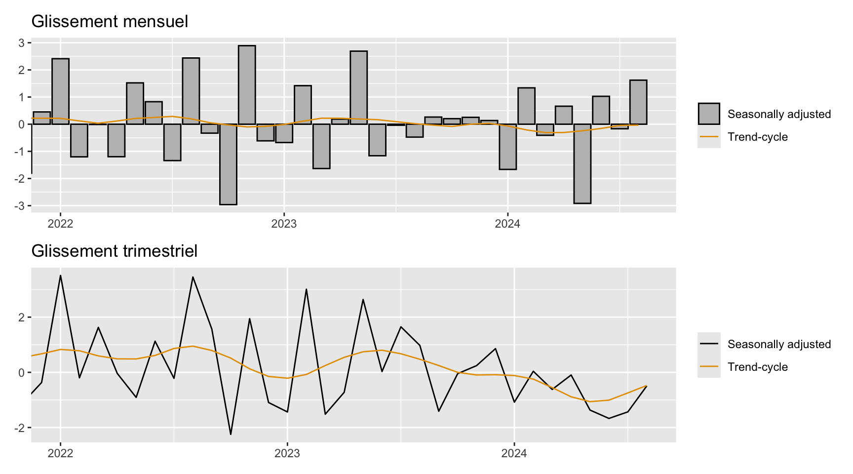 L’inconvénient de cette représentation est qu’elle peut laisser croire qu’il n’y a pas d’incertitude autour des estimations de la série brute ou désaisonnalisée.