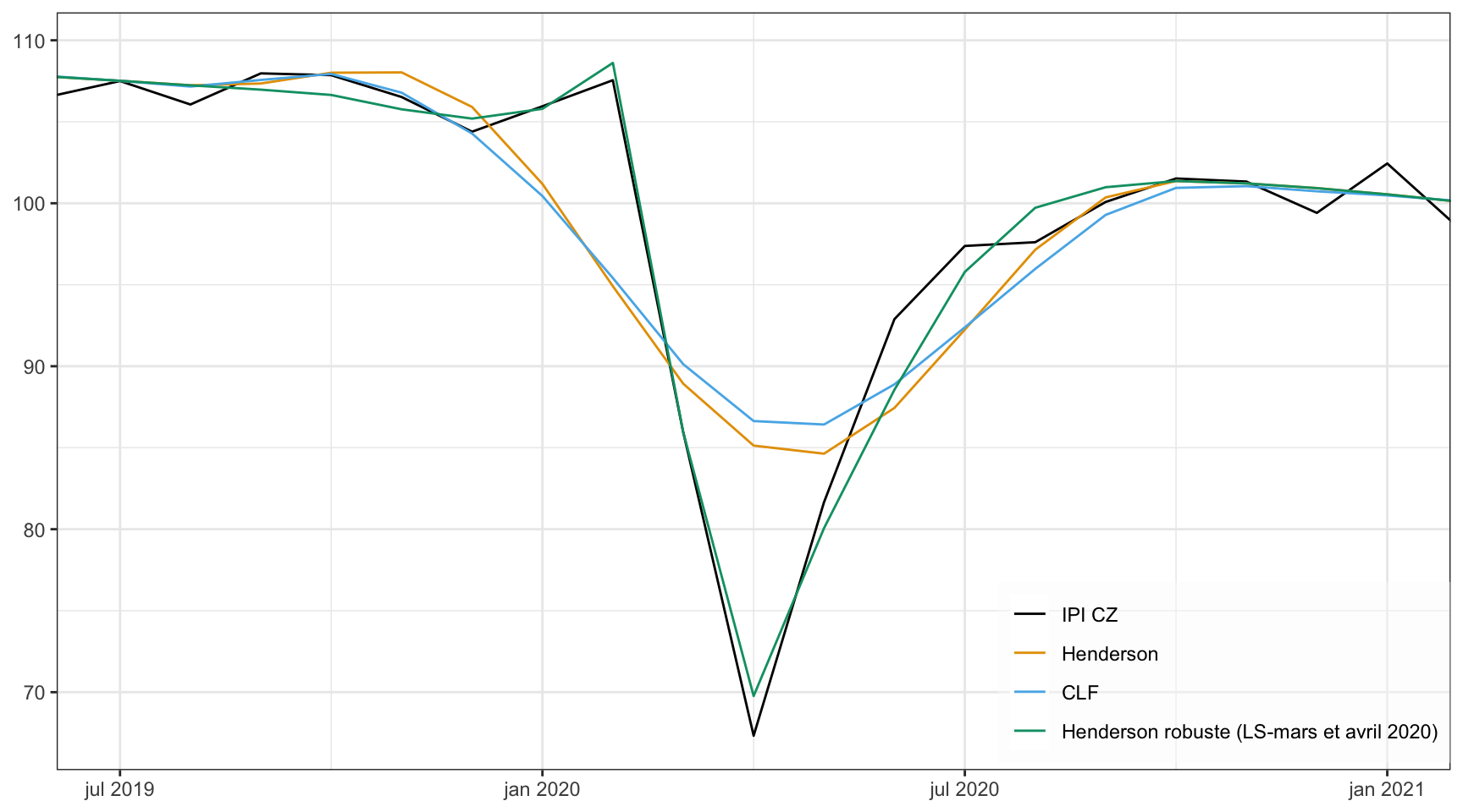 La figure 5.4 montre les estimations de la tendance-cycle sur l’indice de production industrielle (IPI) dans l’industrie manufacturière durant la période du COVID-19. Sur cette période, la propriété souhaitée par la tendance-cycle publiée est de reproduire les points de retournement conjoncturel à la bonne date : un pic en février 2020 et un creux en mars 2020. Seule l’utilisation de moyennes mobiles robustes à deux chocs en niveau en mars et avril 2020 permet de reproduire ce phénomène économique.