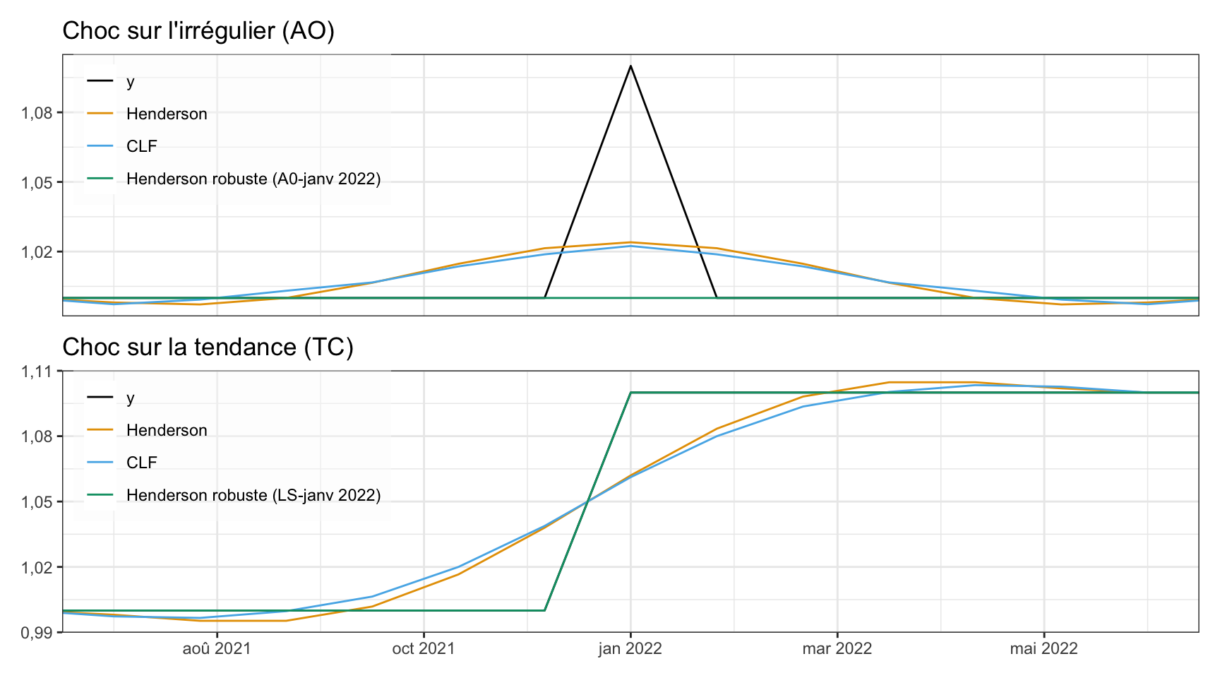 Une dernière approche consiste à construire des moyennes mobiles qui prennent en compte la présence d’un choc modélisé par l’utilisateur. Dans le cadre des moyennes mobiles de Henderson et de Musgrave, cela revient à ajouter un régresseur supplémentaire dans la régression et dans le cadre de la moyenne mobile CLF, cela revient à ajouter ce régresseur dans la modélisation ARIMA. C’est l’approche proposé par Quartier-la-Tente (2025) pour les moyennes mobiles de Henderson et de Musgrave : on parlera alors de « Henderson robuste » ou de « Musgrave robuste ». Elle est implémentée dans la fonction