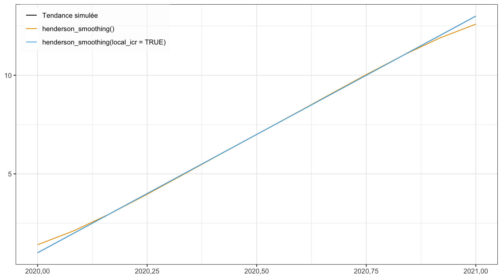 Cette méthode d’estimation de la tendance-cycle peut être appliquée en utilisant la fonction publishTC::henderson_smoothing(). Si la longueur de la moyenne mobile de Henderson n’est pas fixée (paramètre length = NULL, par défaut), elle est déterminée en utilisant l’algorithme de X-13ARIMA-SEATS décrit ci-dessus. Si elle est spécifiée par l’utilisateur et que l’I/C ratio n’est pas défini (paramètre icr = NULL, par défaut), alors ce dernier est également déterminé en utilisant la méthode de X-13ARIMA-SEATS.