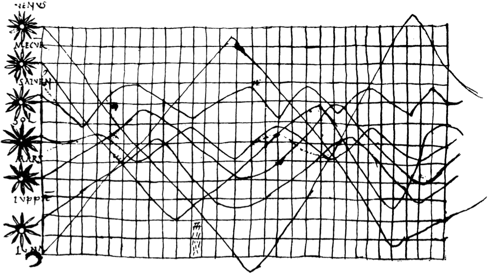 Une série chronologique ou série temporelle est une suite de valeurs numériques ordonnées dans le temps qui permet d’analyser l’évolution d’une variable au fil du temps. Les séries chronologiques sont utilisées dans de nombreux domaines : économie, finance, météorologie, astronomie, musique… Par exemple, le plus ancien diagramme temporel connu du monde occidental (selon Kendall 1973), reproduit par Funkhouser (1936), daterait du Xe siècle et serait une représentation de l’inclinaison des orbites des planètes en fonction du temps qui proviendrait du Commentaire au Songe de Scipion de Macrobe (figure 1.1). Ce diagramme montre des schémas qui semblent se répéter (variations à la hausse et à la baisse à intervalles réguliers), mais ce n’est que bien plus tard, aux XVIIIe et XIXe siècles, que les techniques mathématiques permettront l’analyse des séries chronologiques, notamment grâce à l’approche fréquentielle.