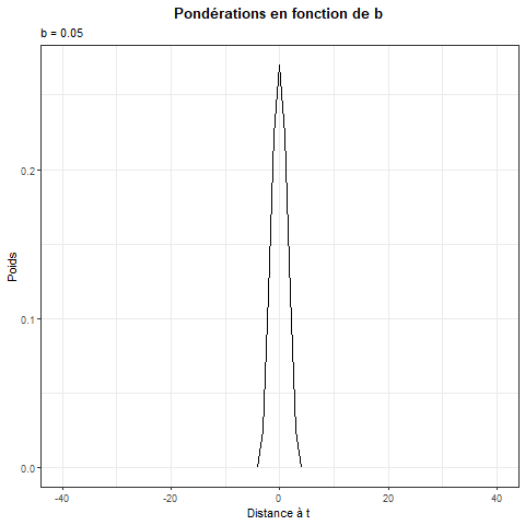 Estimation : \[ \beta(z_t) = \underset{\theta_0}{\argmin}\sum_{j=1}^T\left(y_{j}-x_j\theta_0\right)^2K_b(z_j-z_t) \] Avec \(K_b(x)=\frac 1 b K(x/b)\) une fonction de noyau pour pondérer les observations.