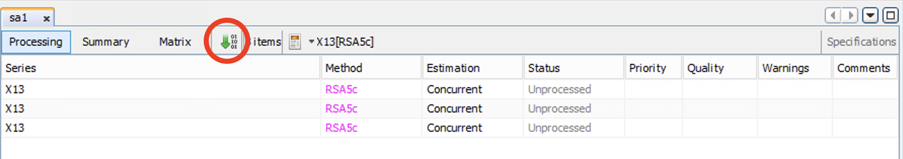 +à côté de « x13 » puis cliquer surRSA5c(ouRSA5si l’on utilise JDemetra+ > 3.0.0)Cliquer quelque part dans SAProcessing-1