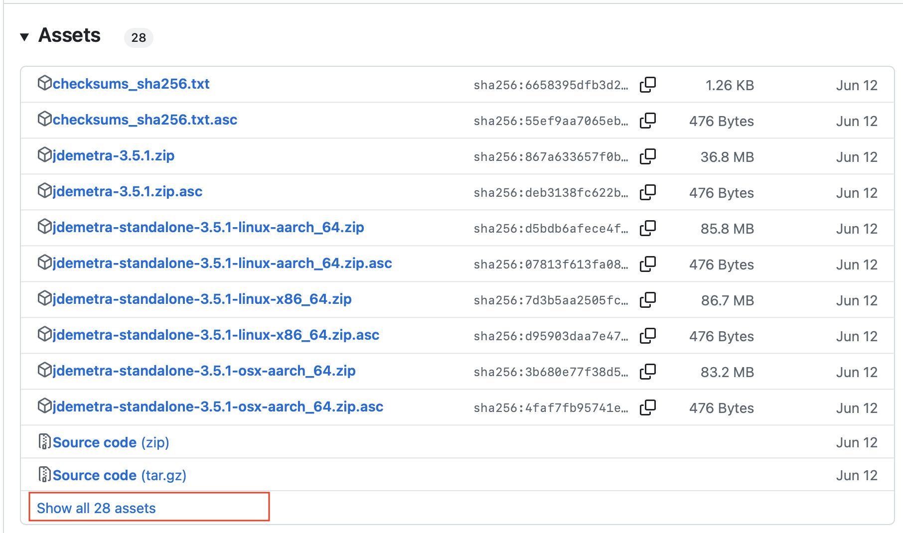 Les version 3.0.0 et plus de JDemetra+ et du JWSACruncher sont disponibles ici : https://github.com/jdemetra/jdplus-main/releases. Chaque version possède un installateur comprenant directement une version portable de Java (versions “standalone”) : c’est l’approche que nous recommandons pour éviter de télécharger Java de manière indépendante et de faire la configuration. Dans le cadre de la version 3.5.1, la fichier à télécharger sous Windows est jdemetra-standalone-3.5.1-windows-x86_64.zip. Pour le trouver, une fois sur la page GitHub, il faut cliquer sur le lien Show all assets :