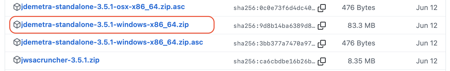 Les version 3.0.0 et plus de JDemetra+ et du JWSACruncher sont disponibles ici : https://github.com/jdemetra/jdplus-main/releases. Chaque version possède un installateur comprenant directement une version portable de Java (versions “standalone”) : c’est l’approche que nous recommandons pour éviter de télécharger Java de manière indépendante et de faire la configuration. Dans le cadre de la version 3.5.1, la fichier à télécharger sous Windows est jdemetra-standalone-3.5.1-windows-x86_64.zip. Pour le trouver, une fois sur la page GitHub, il faut cliquer sur le lien Show all assets :